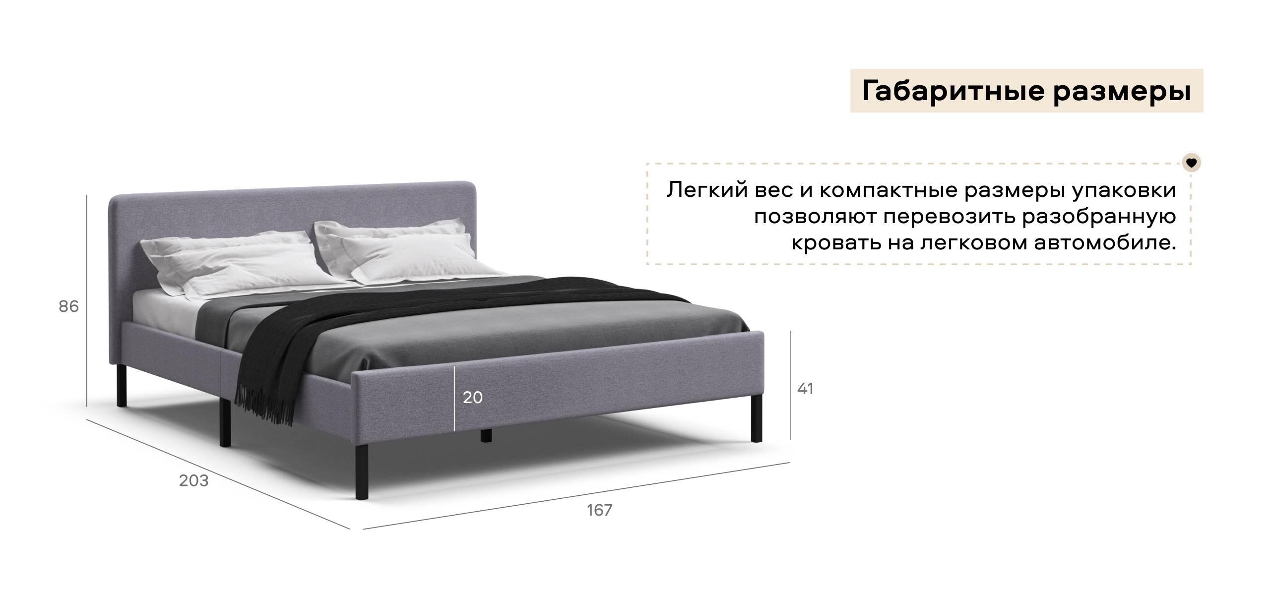 Кровать можно разобрать, переместить и снова собрать много раз, без потери ее свойств. Легкий вес и компактные размеры упаковки позволяют перевозить разобранную кровать на легковом автомобиле.