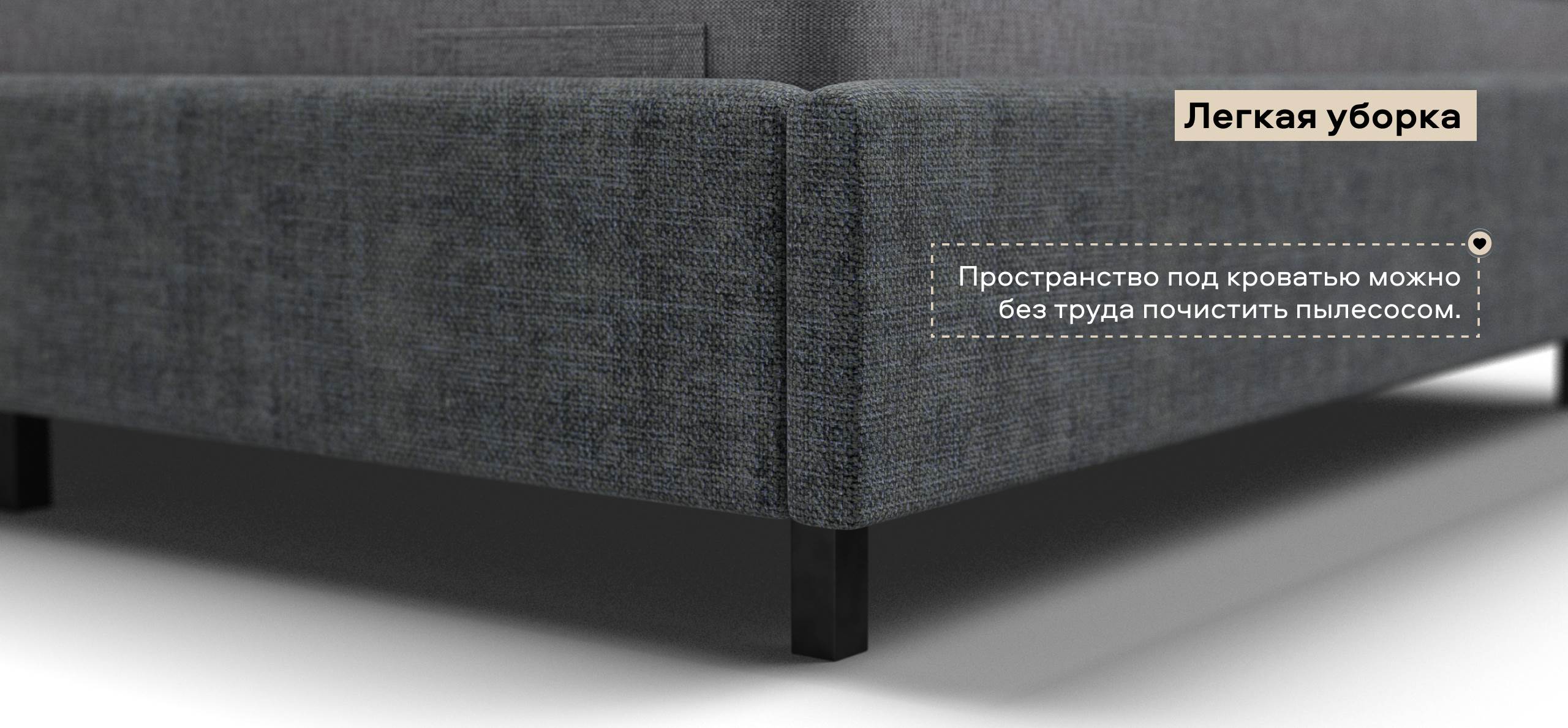 Простота уборки. Высокие ножки не только придают кровати визуальную лёгкость, но и обеспечивают удобство уборки — вы без труда сможете пылесосить пространство под кроватью.
