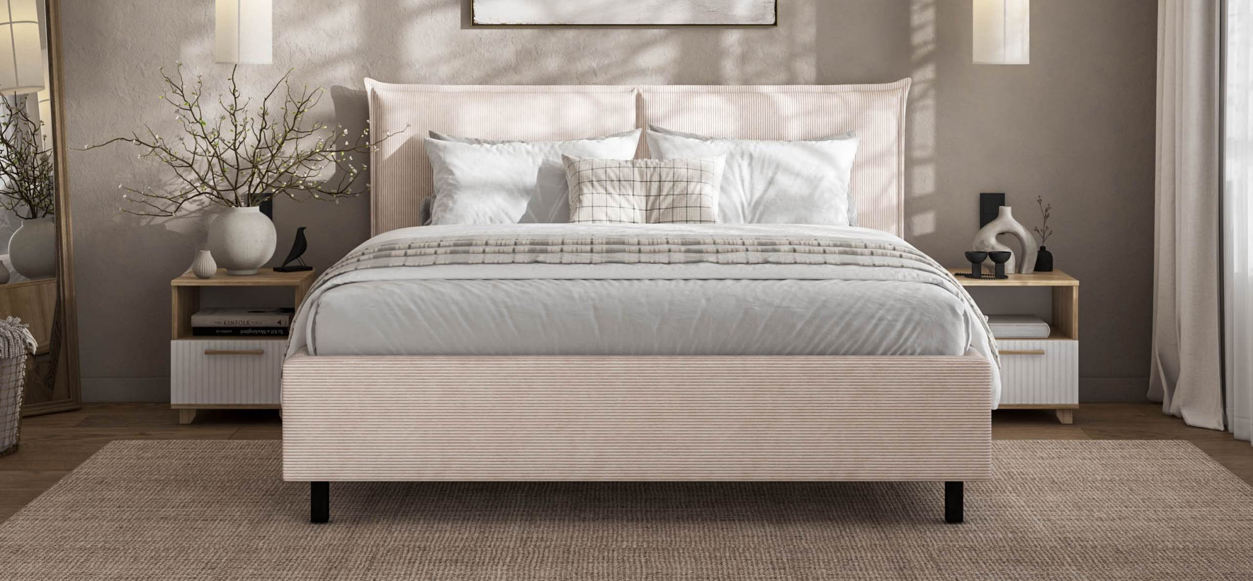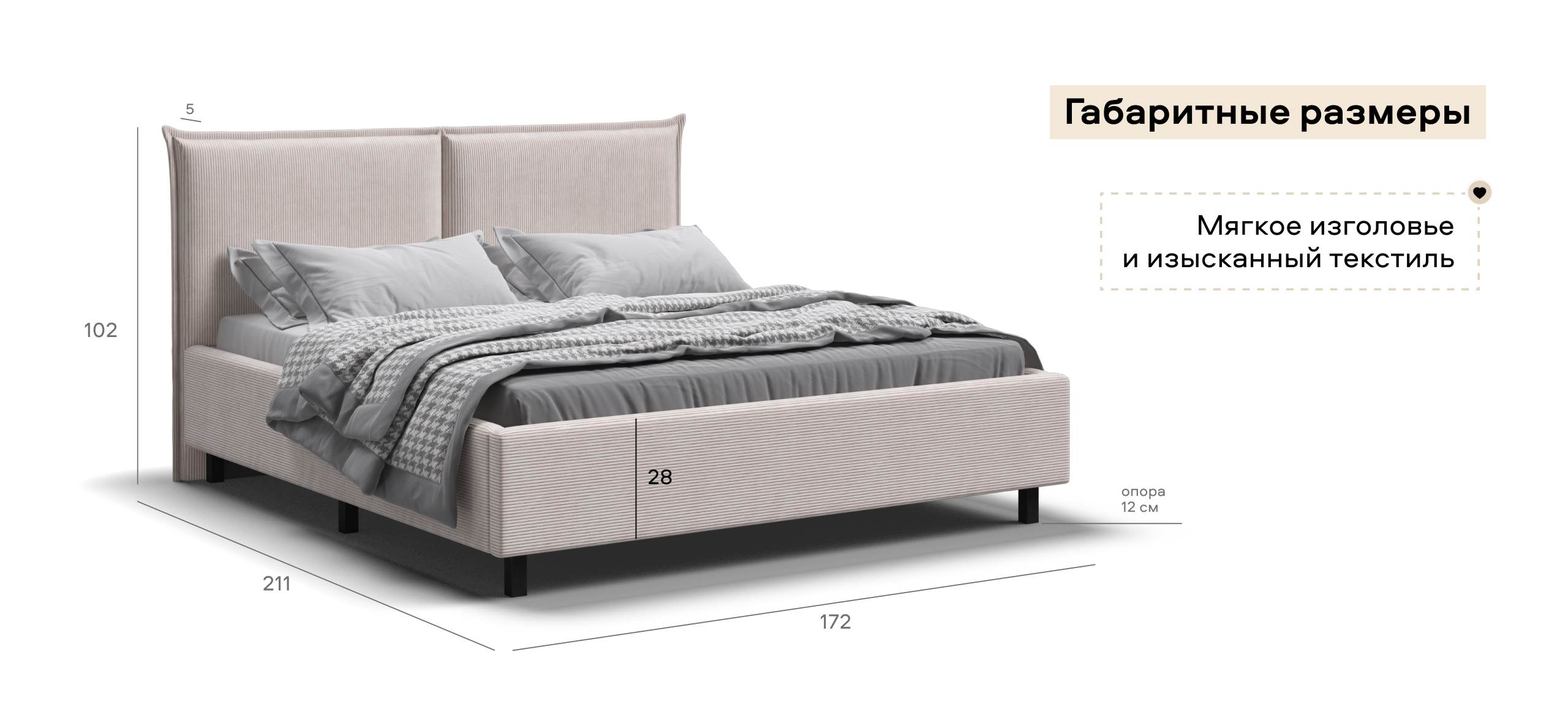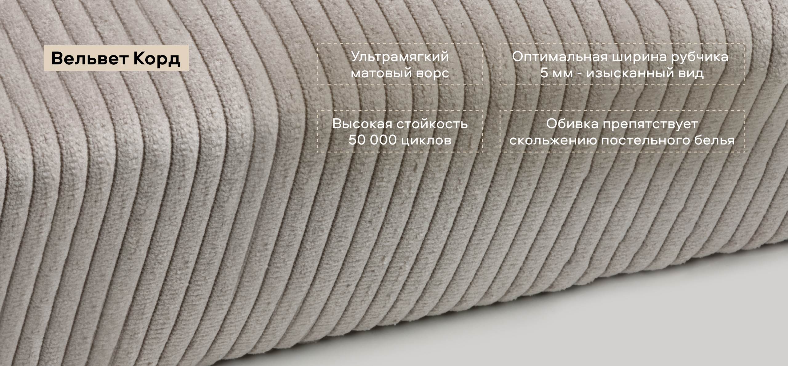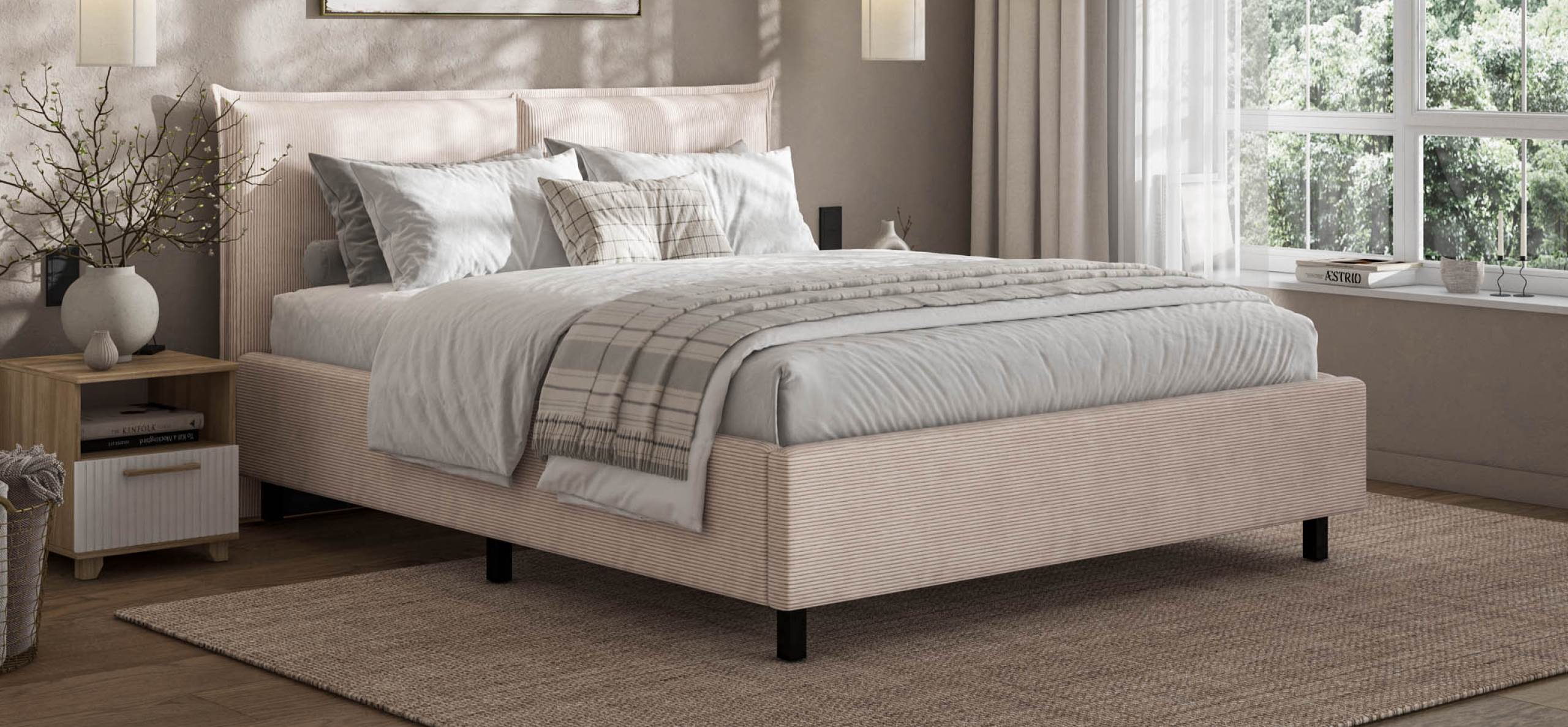 Мягкое изголовье и изысканный текстиль. Обивка из ультрамягкого вельвета CORD с бархатистой структурой создаёт уют и комфорт. Оптимальная ширина рубчика придаёт ткани стильный и современный вид, дополняя интерьер и делая отдых перед сном особенно приятным.