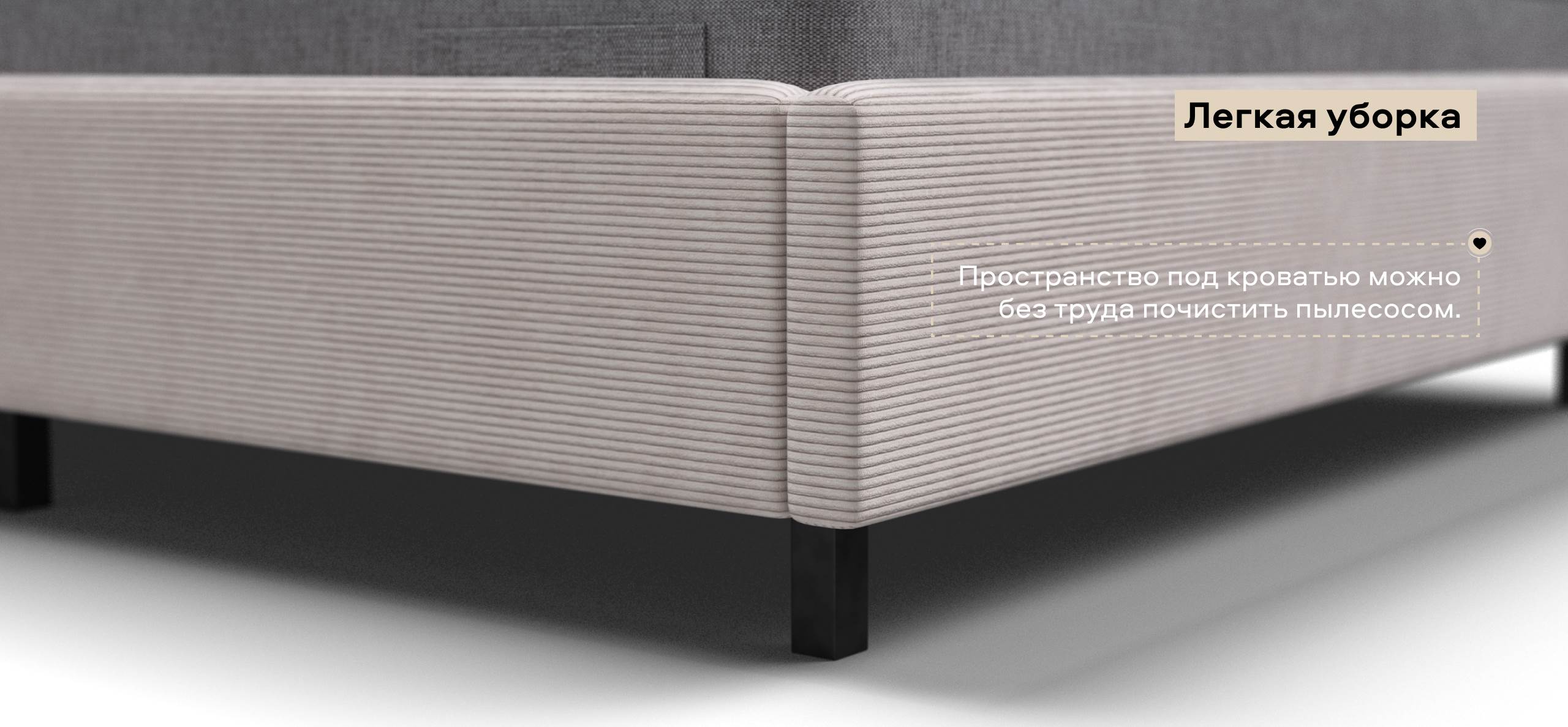 Простота уборки. Высокие ножки не только придают кровати визуальную лёгкость, но и обеспечивают удобство уборки — вы без труда сможете пылесосить пространство под кроватью.
