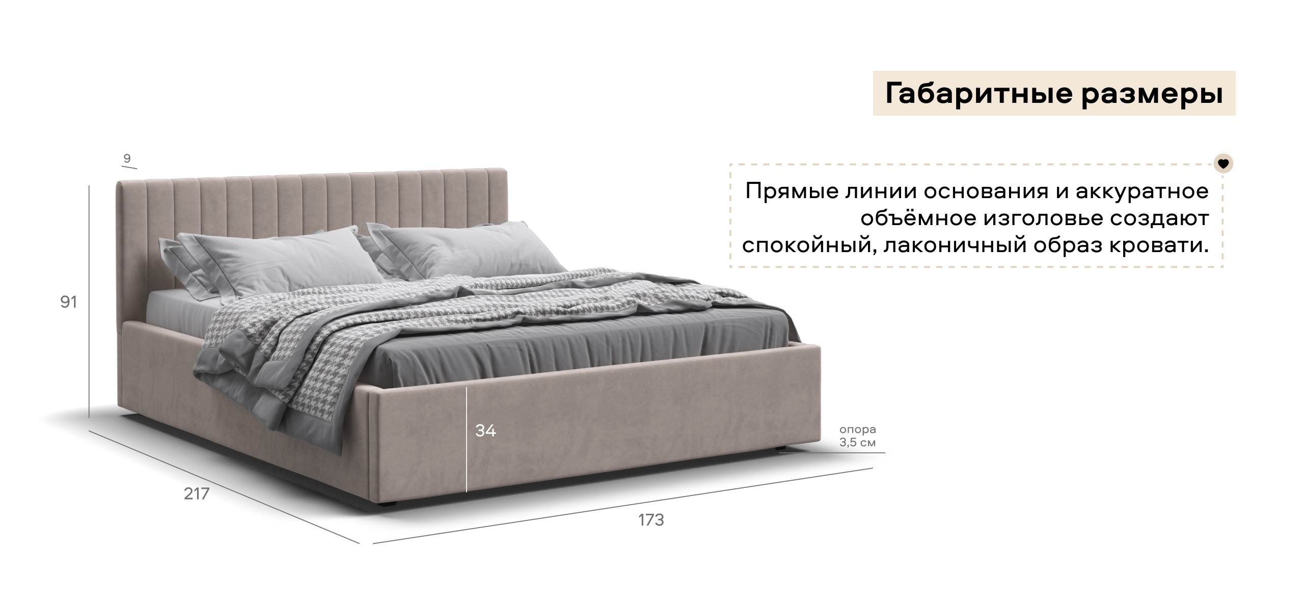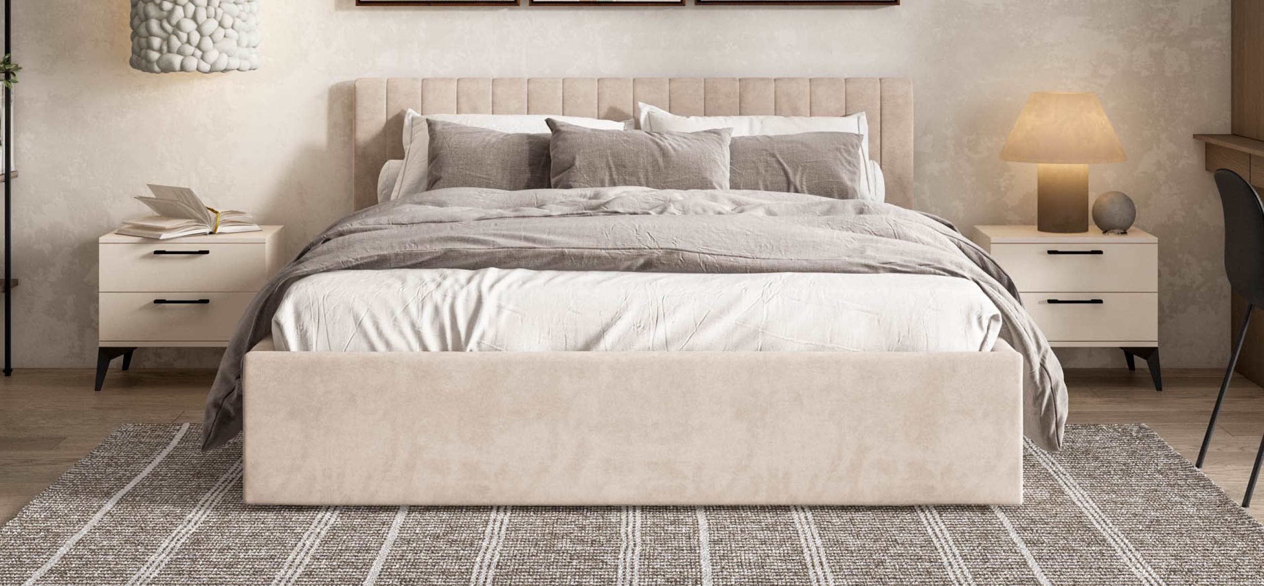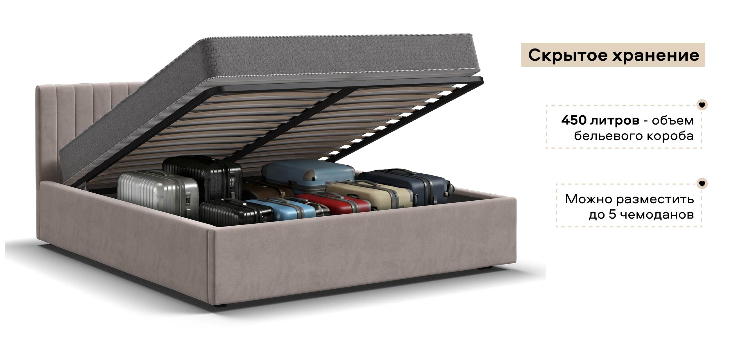 В кровати используются газлифты из авиационного алюминия SpaceLift, что обеспечивает легкость и надежность подъема. Скрытое отделение для хранения белья объемом 450 литров, HideBox, добавляет практичности и помогает поддерживать порядок в спальне.