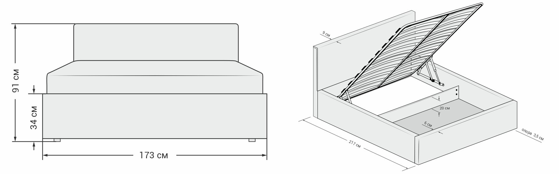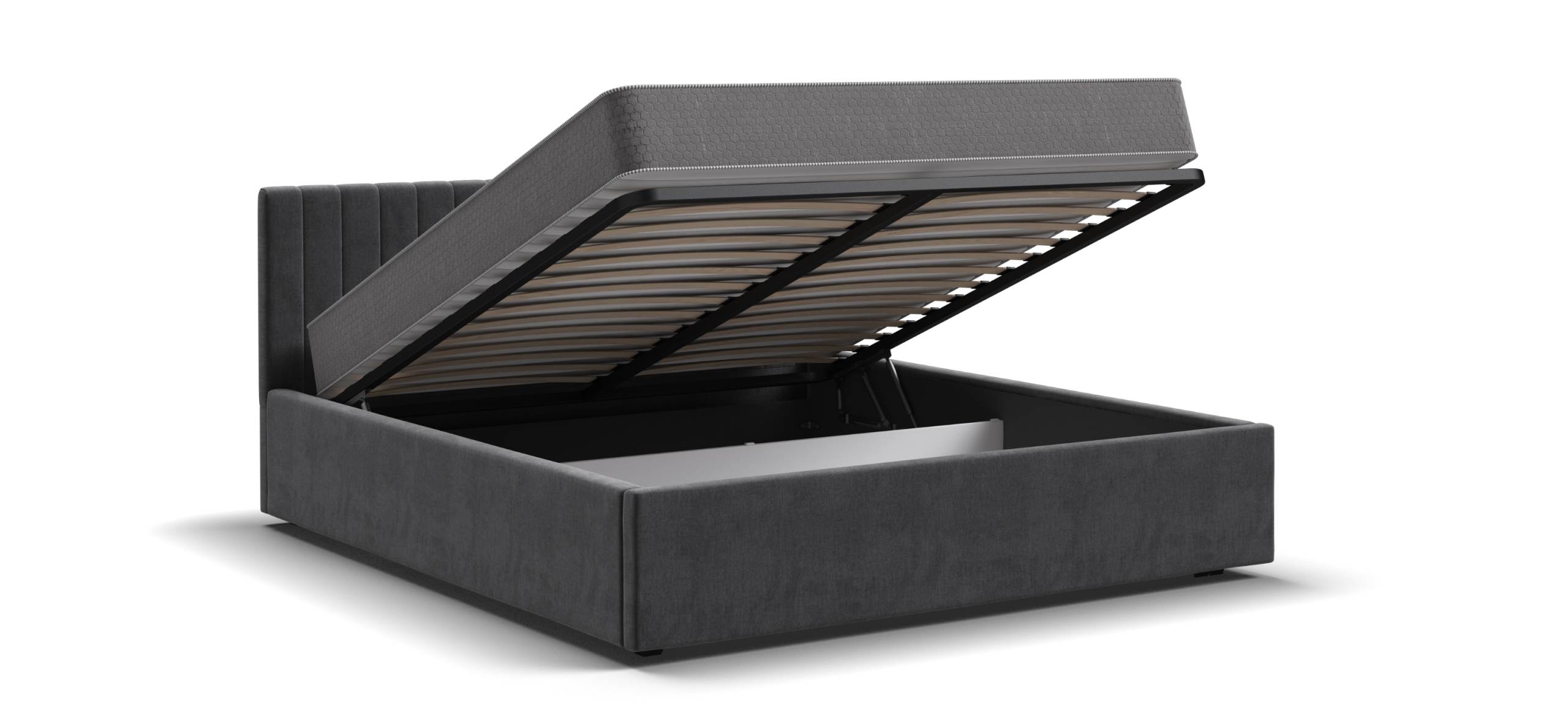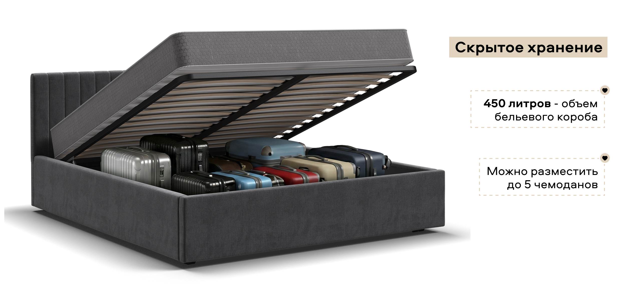 В кровати используются газлифты из авиационного алюминия SpaceLift, что обеспечивает легкость и надежность подъема. Скрытое отделение для хранения белья объемом 450 литров, HideBox, добавляет практичности и помогает поддерживать порядок в спальне.