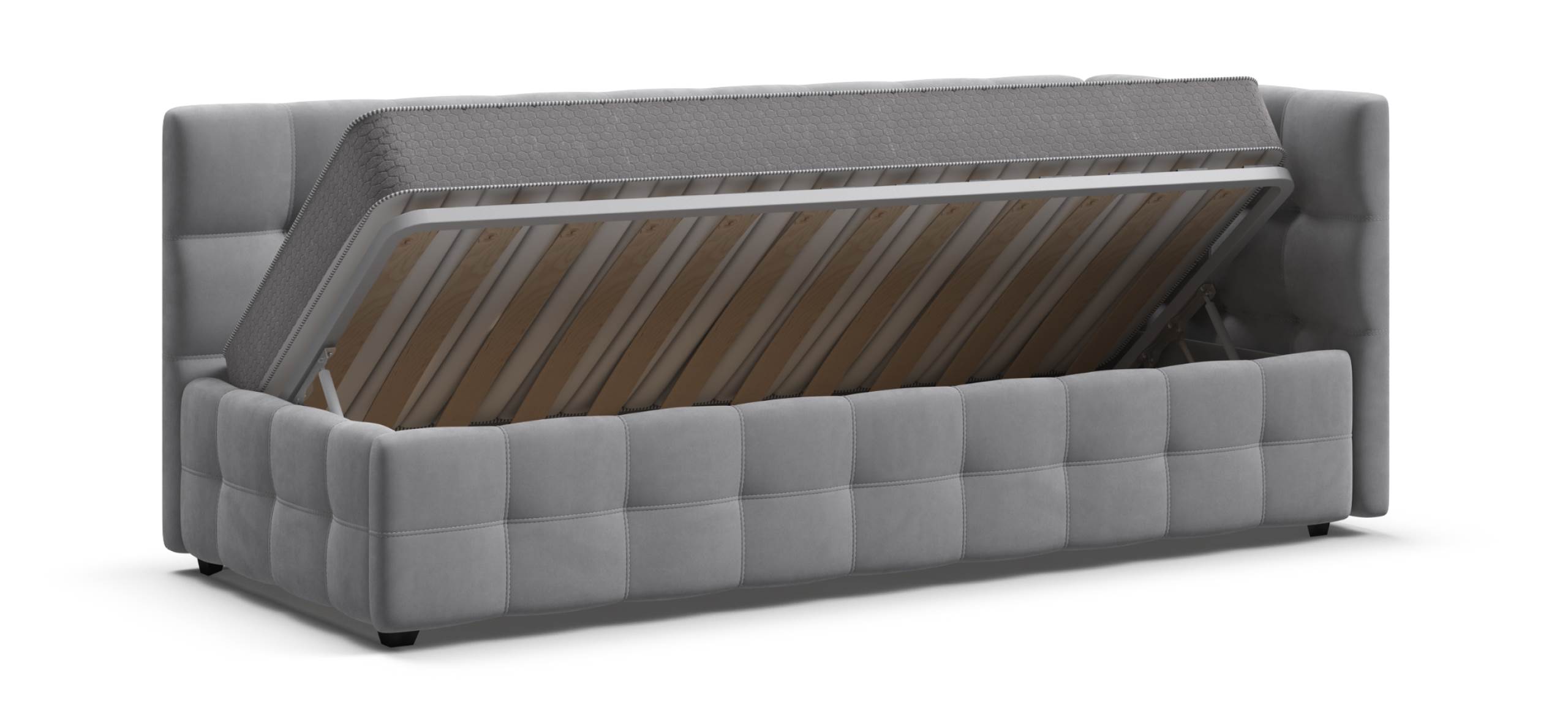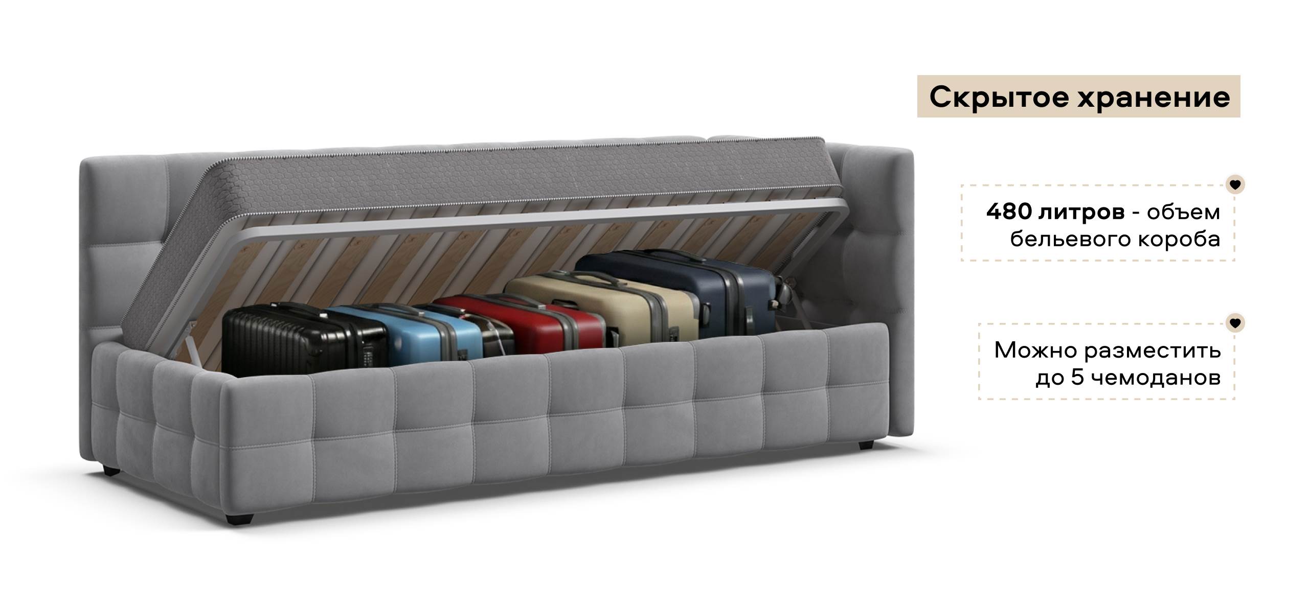 Кровать оснащена вместительным отсеком для хранения HideBox объемом 480 литров. Это позволяет удобно хранить постельное белье, игрушки или другие вещи, освобождая пространство в комнате и поддерживая порядок.