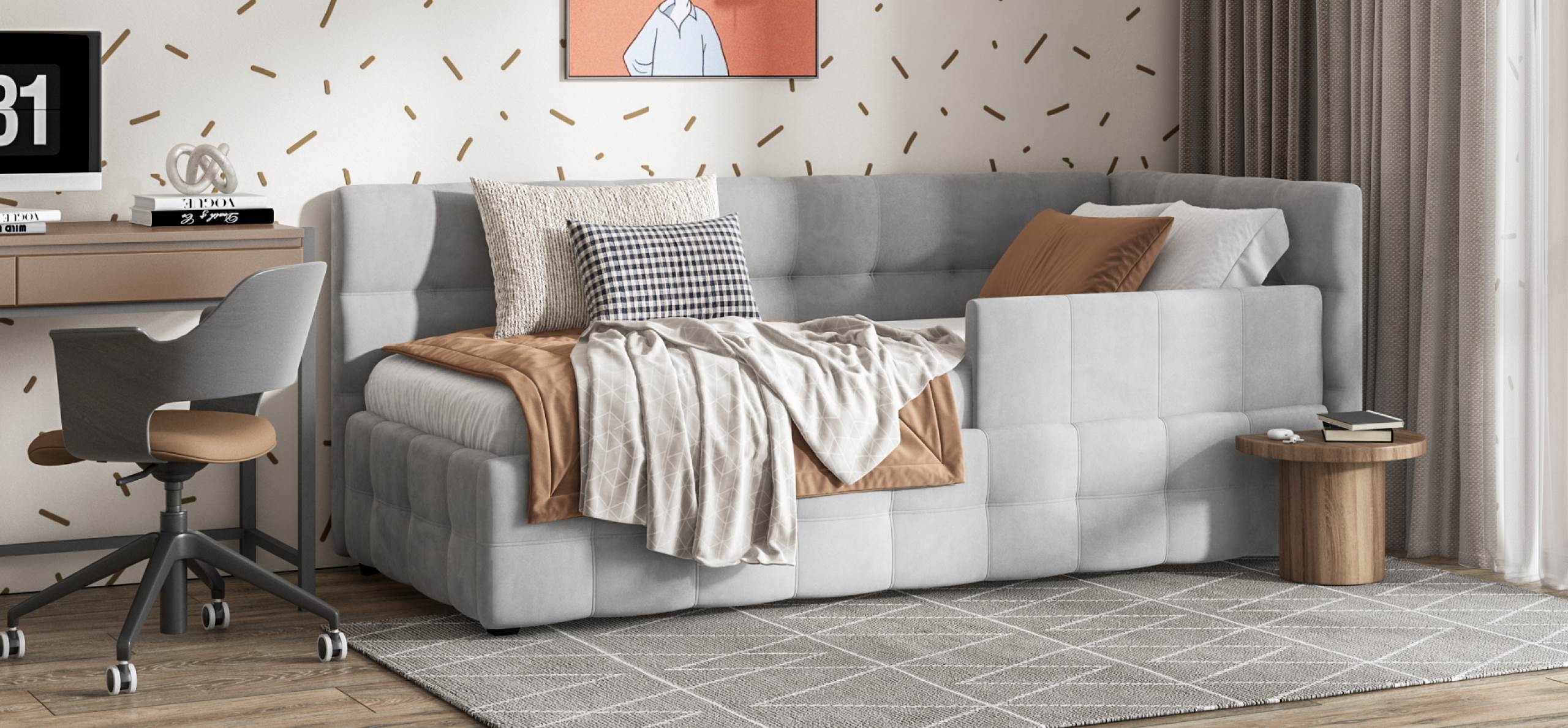 Кровать оснащена усиленным ортопедическим основанием HEALTHY SLEEP, что гарантирует правильную поддержку тела во время сна. Это особенно важно для здорового развития позвоночника, делая кровать отличным выбором для детей и подростков.
