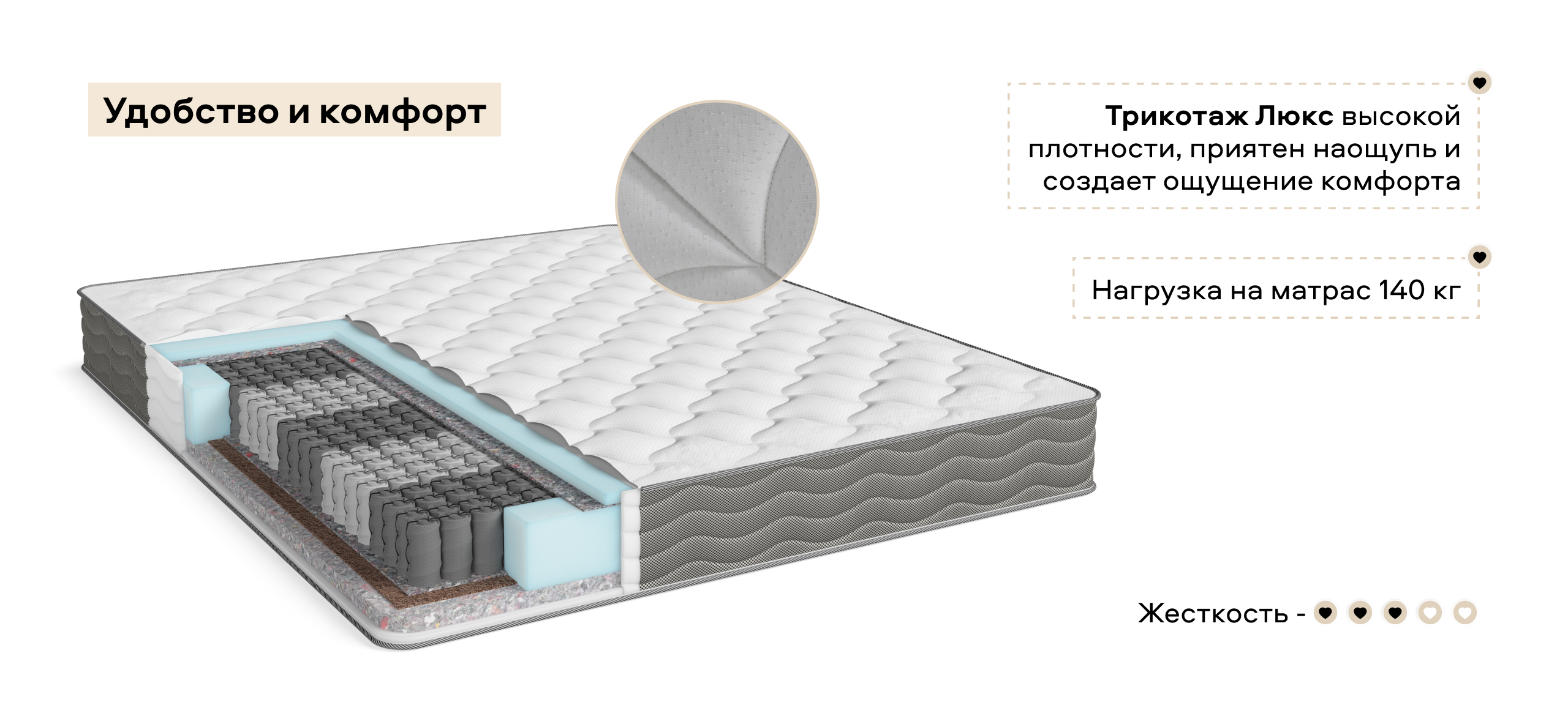 Материалы, такие как термовойлок и ANATOMIX LUX, добавляют дополнительные слои комфорта и продлевают срок службы матраса, обеспечивая умеренную жесткость и упругость, а также отличную воздухопроницаемость.