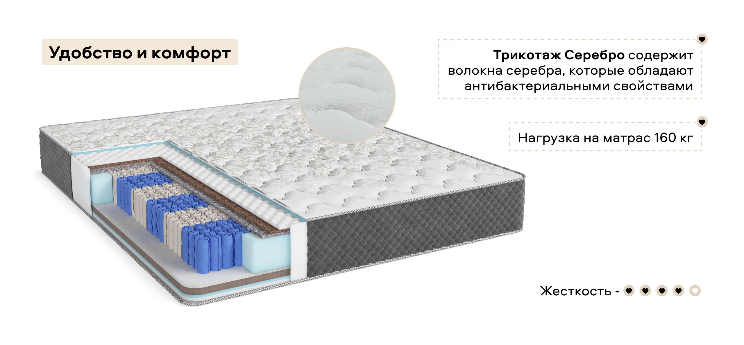 Особую мягкость матрасу придает чехол из трикотажа Silver повышенной износостойкости c антибактериальной и гипоаллергенной пропиткой на пышной двухслойной стежке из пены SOFTFOAM AIR и синтепона. Трикотаж Silver - содержит волокна с ионами серебра, что придает ткани антибактериальные и антимикробные свойства. Данная ткань быстро отводит влагу, выделяемую телом, создавая комфорт и сокращая потери тепла в результате конвекции.