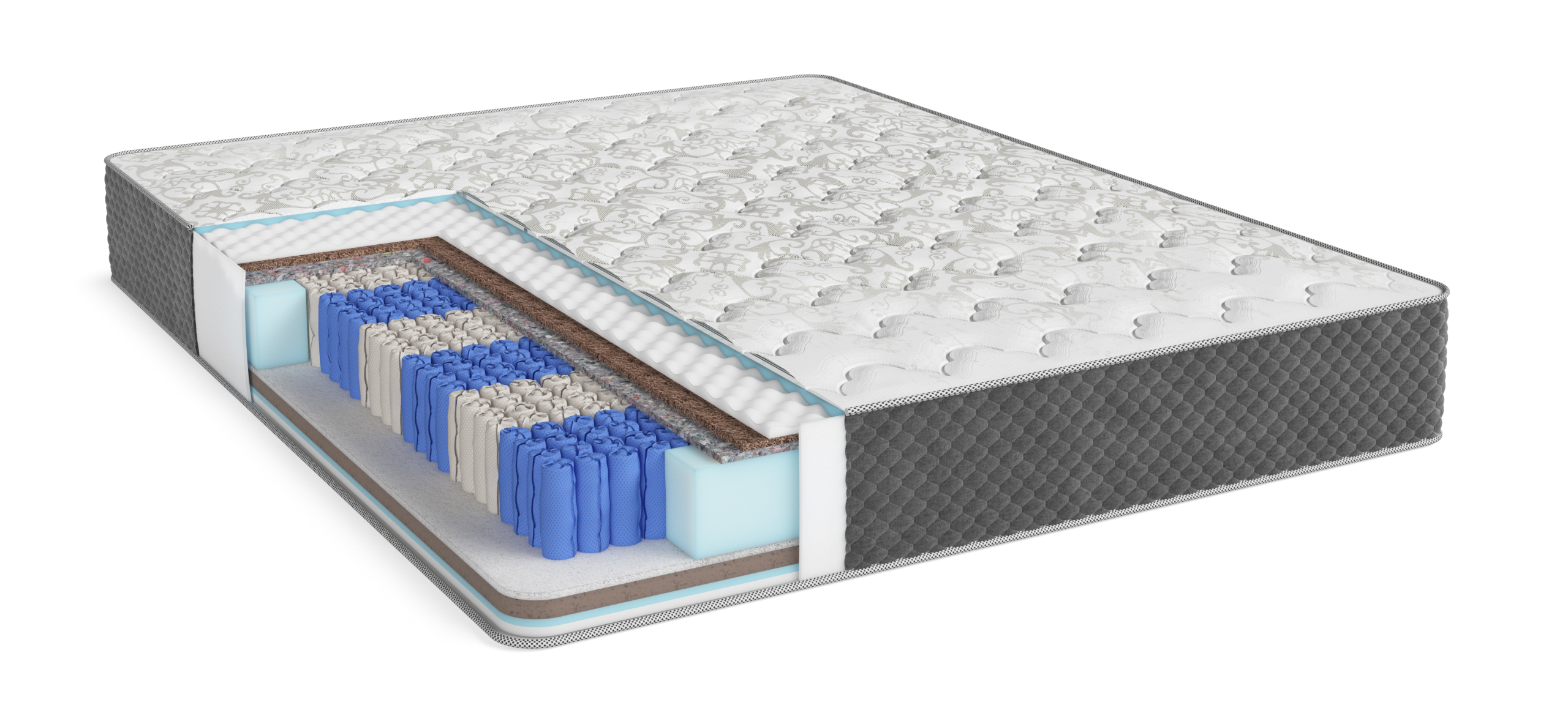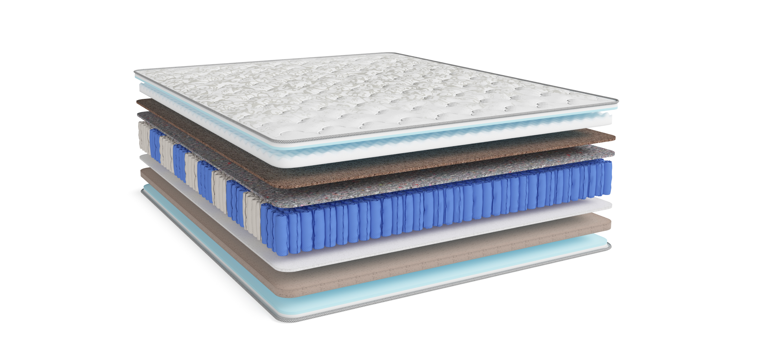 Пена с эффектом памяти MEMORIX AIR, латексированная кокоcовая койра, термовойлок, НПБ KING SPRING 1500, слой BOSS SKIN, пена COPPERFOAM с частицами меди