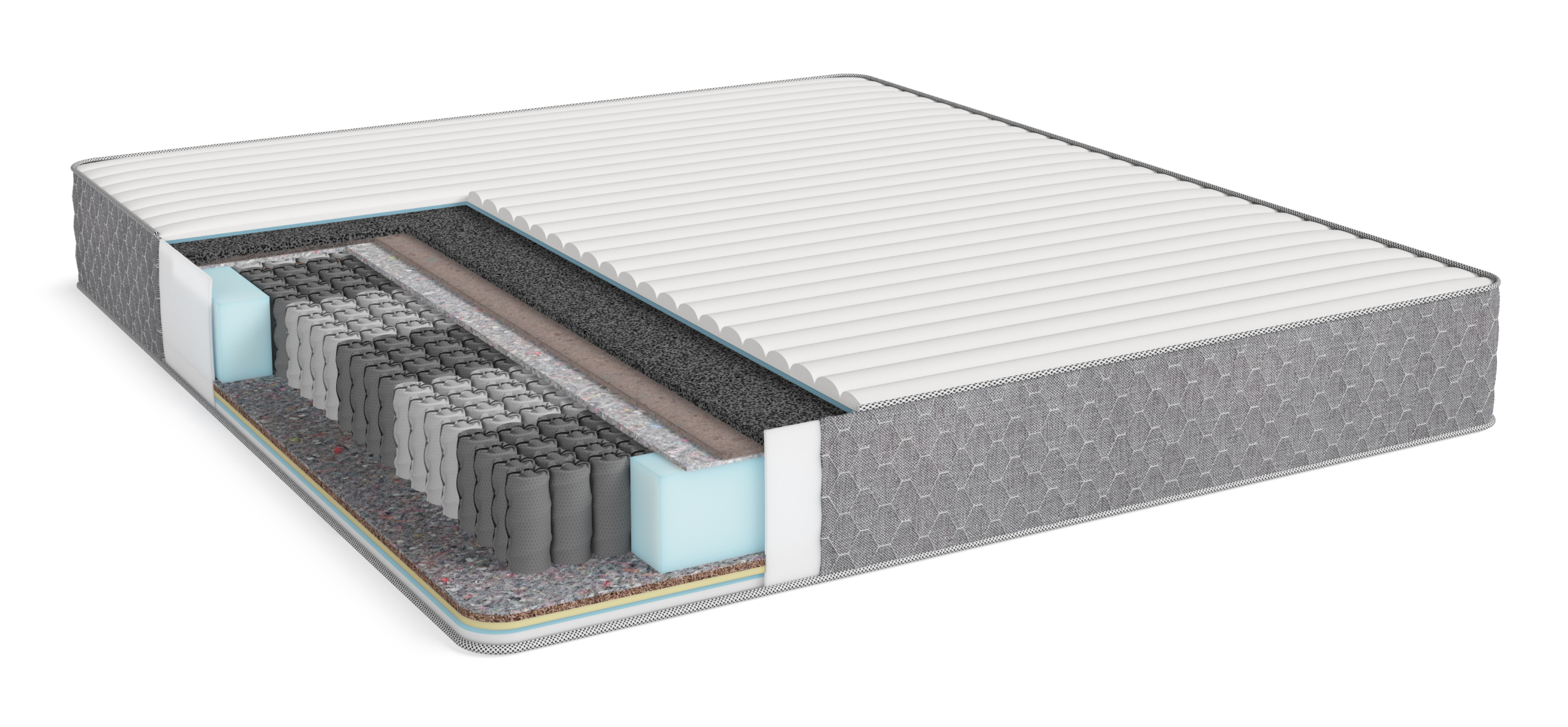Угольная пена CARBONE FOAM, слой BOSS SKIN, термовойлок, НПБ COMFY SPRING 950, латексированная кокосовая койра, искусственный латекс