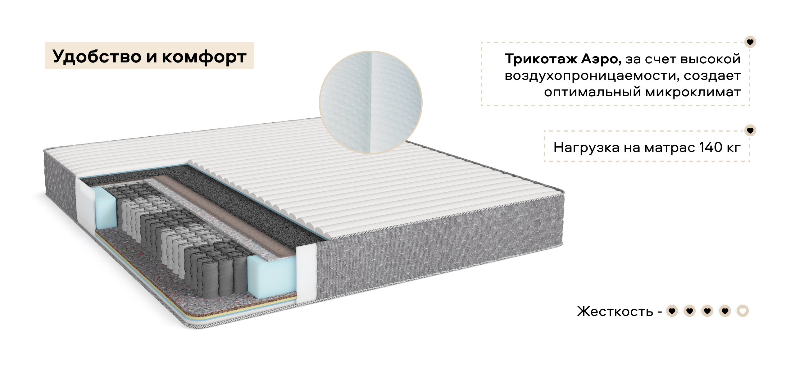 Матрас имеет в своём составе инновационный экологически чистый материал ECO LATEX, обладающий всеми свойствами натурального латекса, обеспечивающий анатомически правильную поддержку тела во время сна. Слой гипоаллергенной пены с угольной пропиткой CARBOAN FOAM препятствует развитию вредных микроорганизмов, не накапливает пыль и снимает мышечное напряжение. Натуральная латексированная кокосовая койра обеспечивает анатомически правильную жесткость спального места.