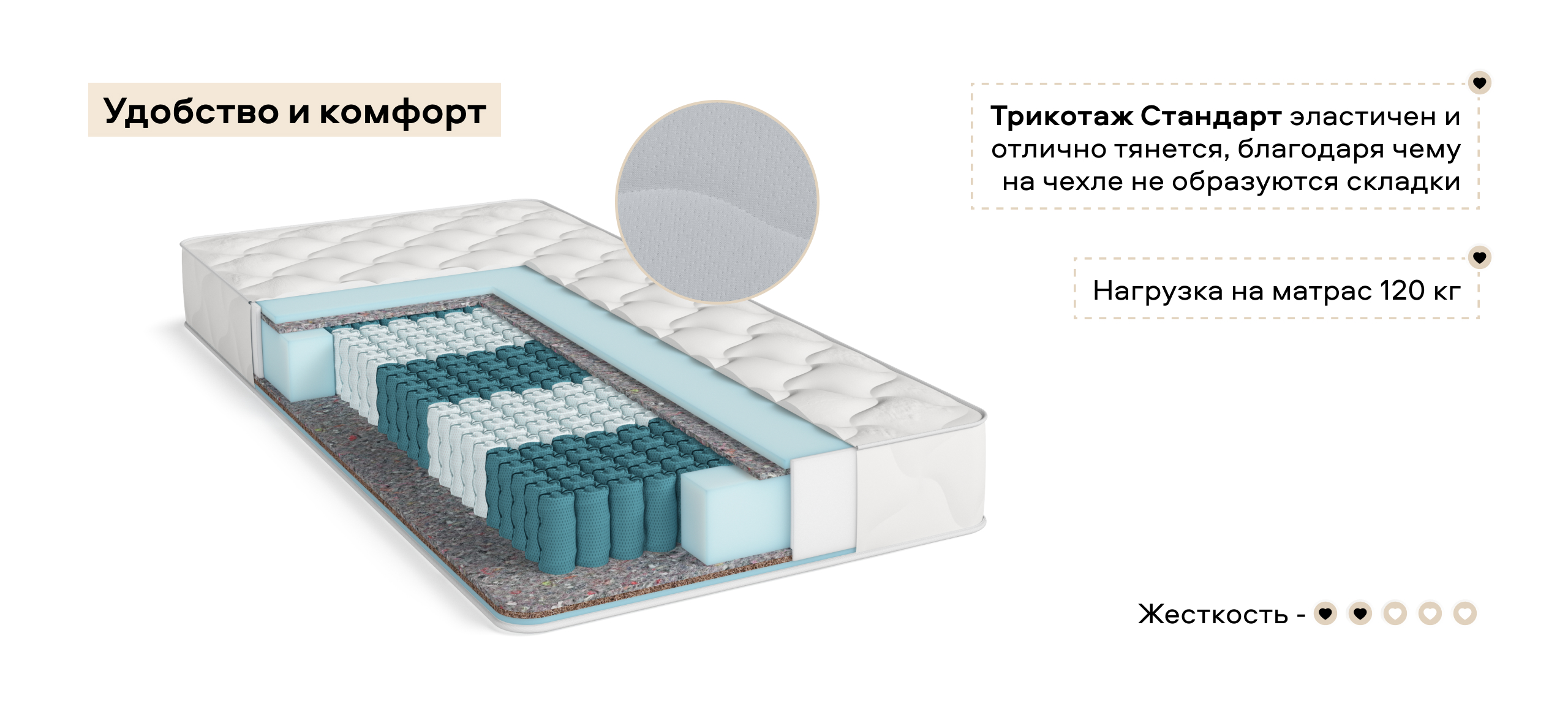 Латексированная кокосовая койра в составе матраса усиливает его вентиляционные свойства и способствует равномерному распределению нагрузки. Это делает матрас LUX особенно привлекательным для тех, кто ищет здоровый и комфортный сон без лишних затрат.