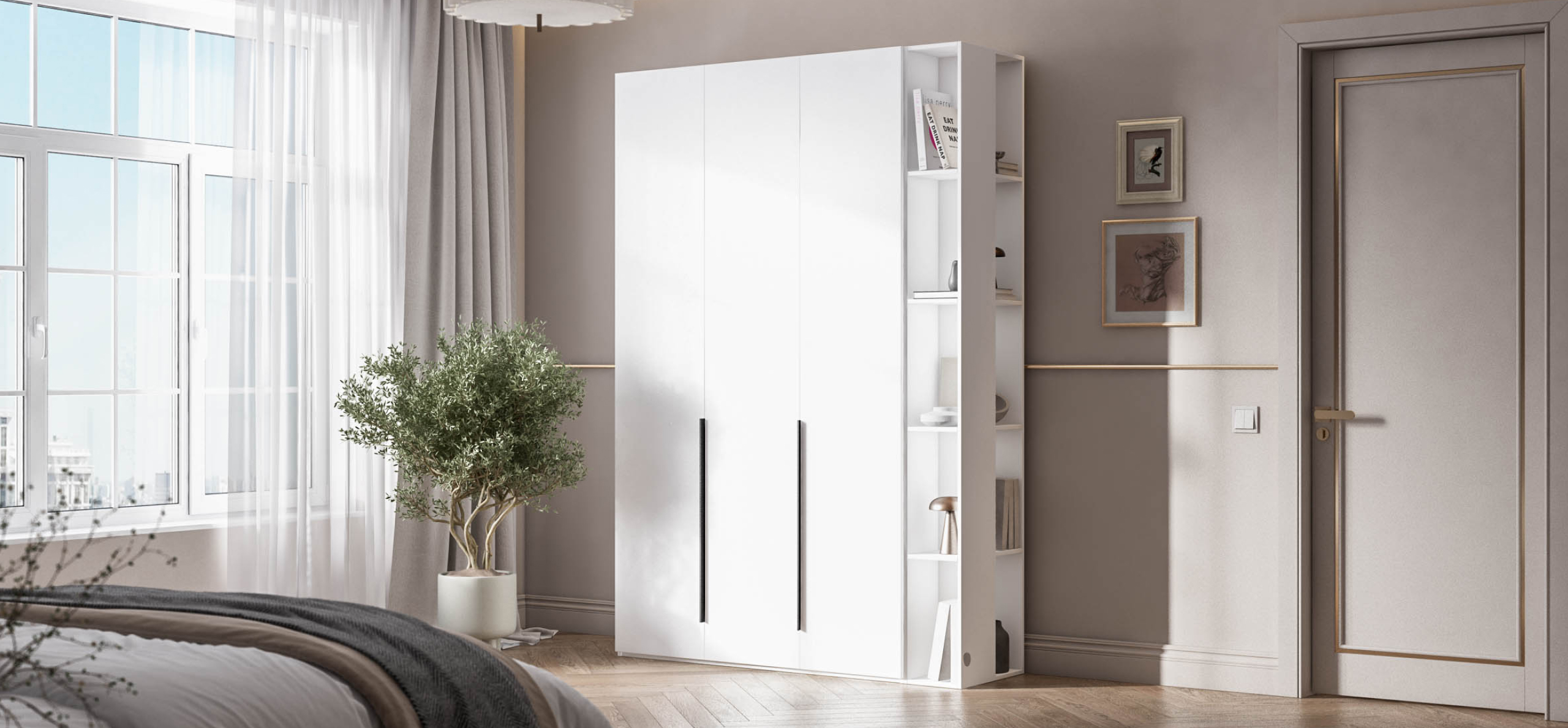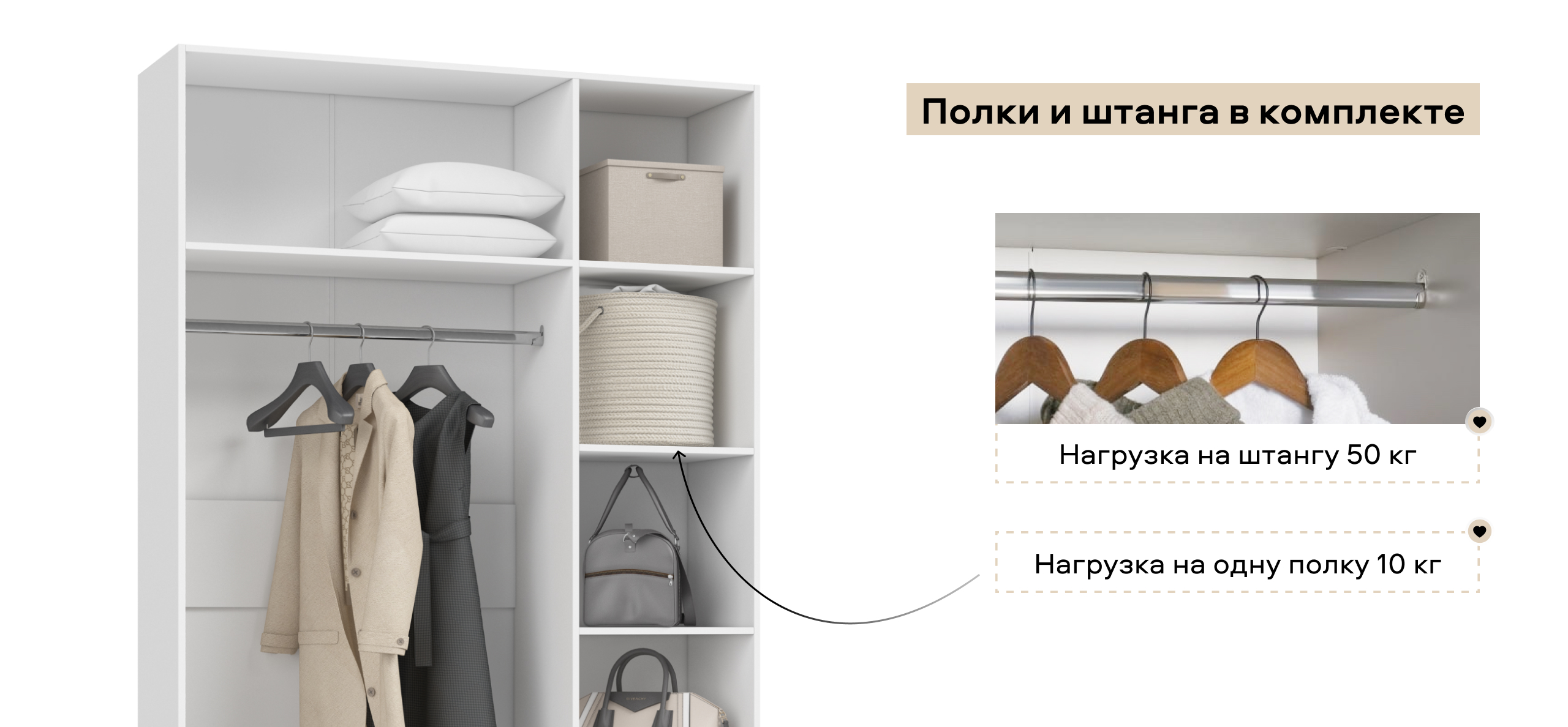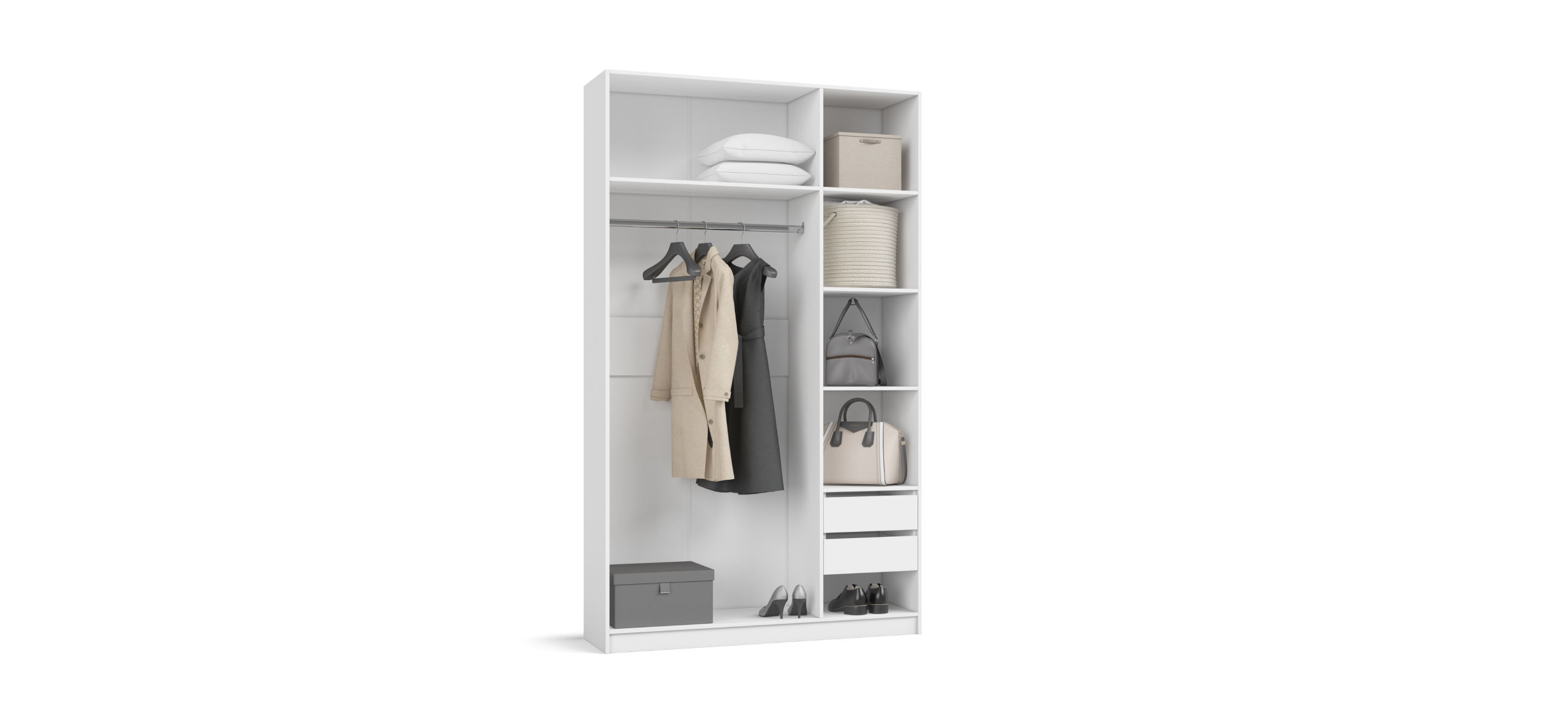 Полки и ящики можно установить с любой стороны — справа или слева. Шкаф адаптируется под вашу планировку и привычки, обеспечивая комфорт в использовании