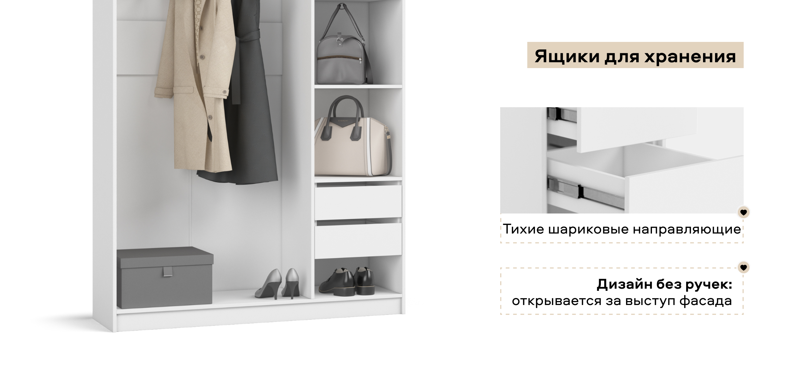 Ящики на шариковых направляющих Плавное и надёжное выдвижение даже при полной загрузке. Удобное решение для повседневного хранения без компромиссов