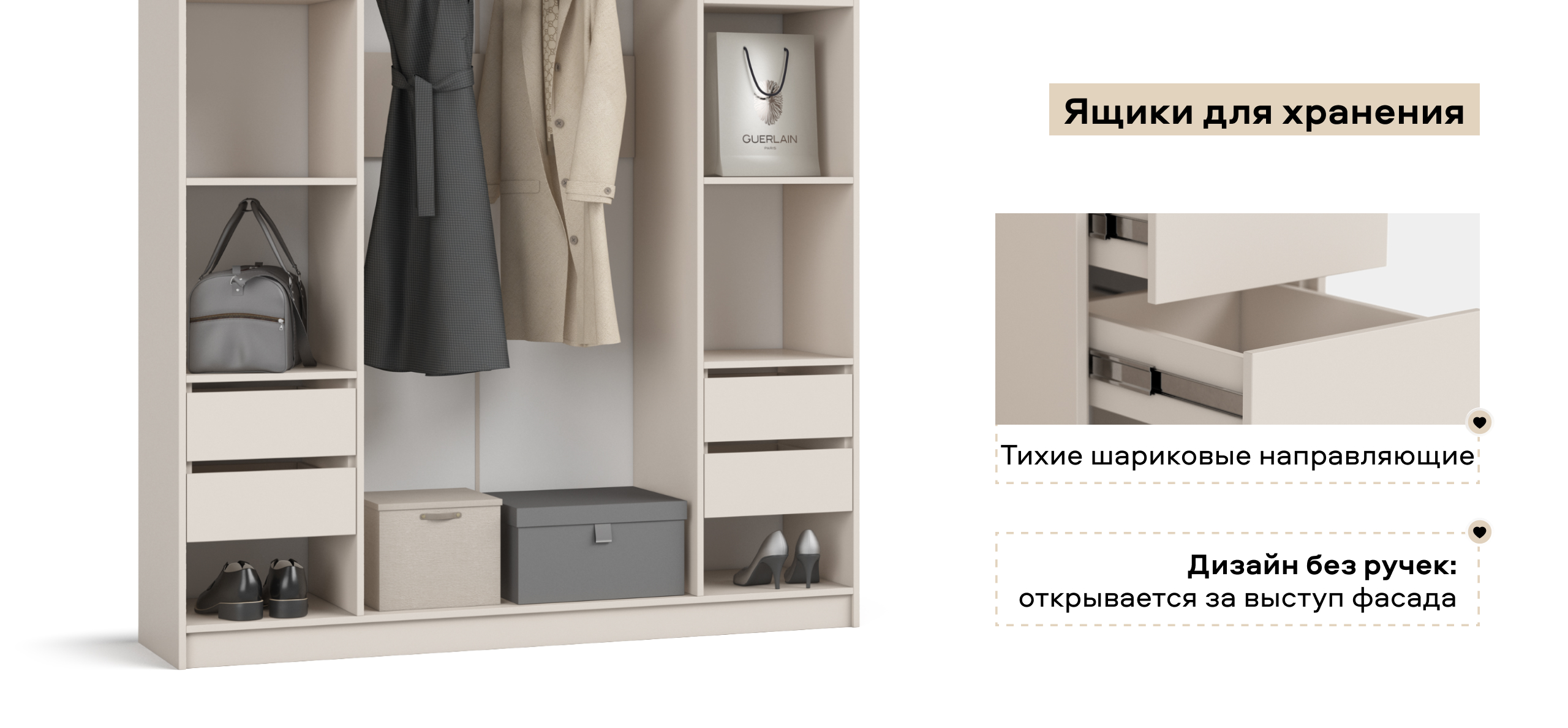 Ящики на шариковых направляющих Плавное и надёжное выдвижение даже при полной загрузке. Удобное решение для повседневного хранения без компромиссов