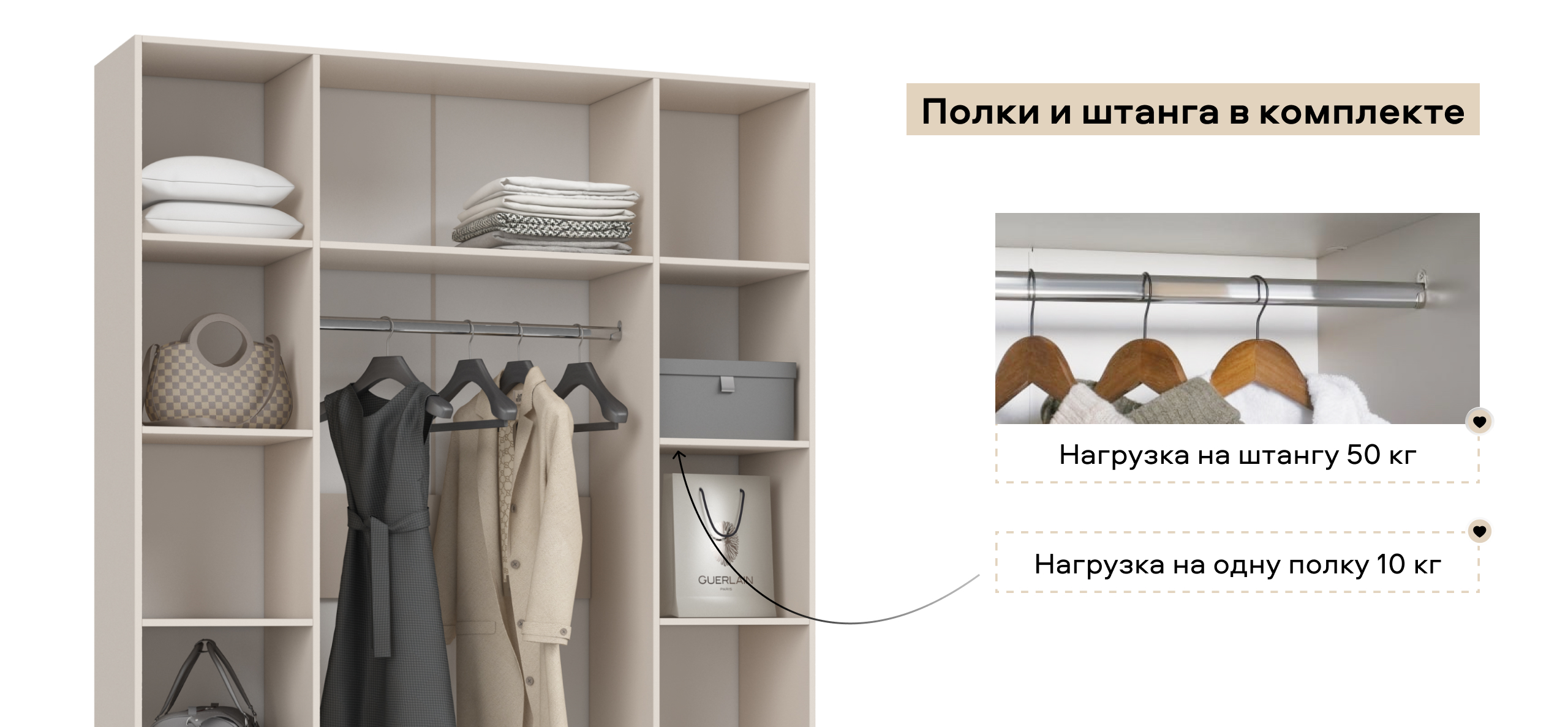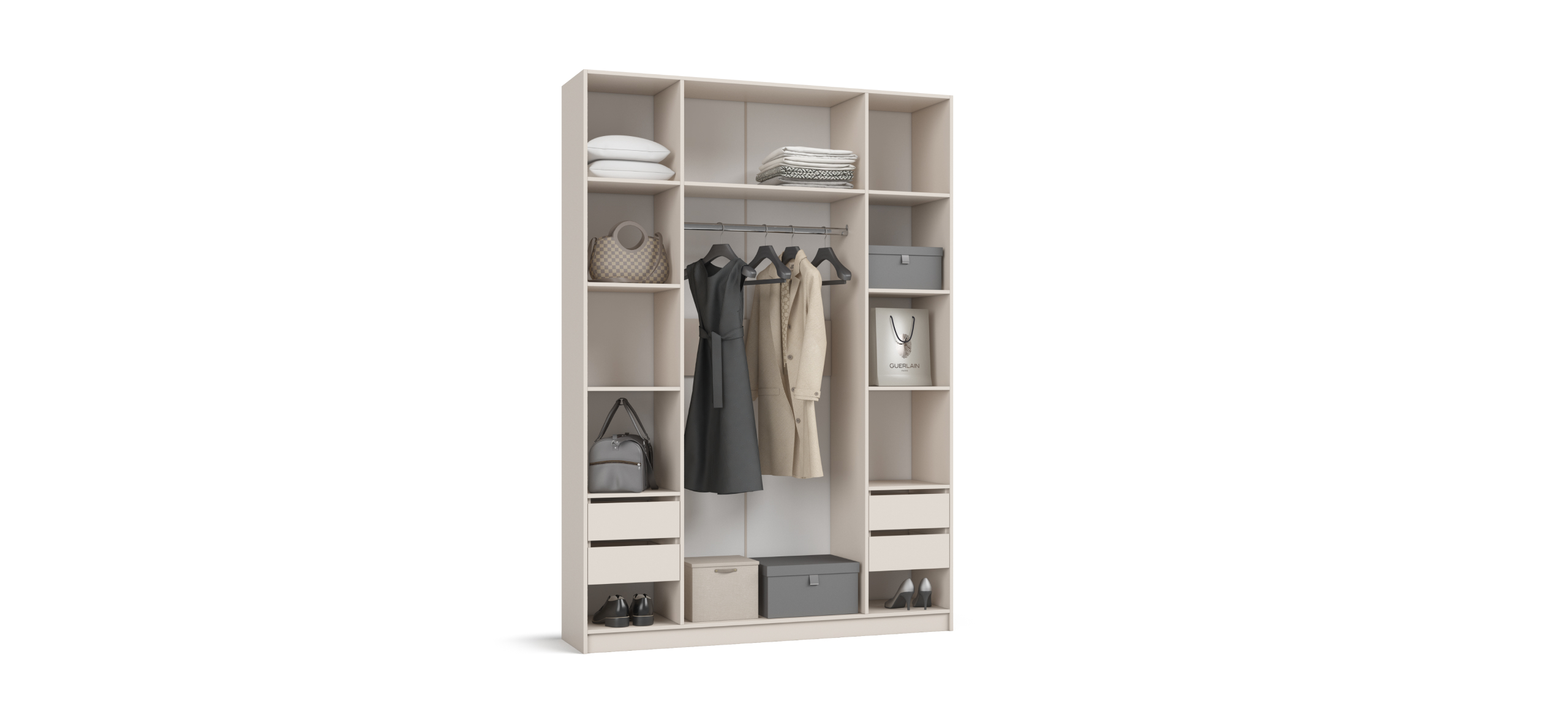 Полки и ящики можно установить с любой стороны — справа или слева. Шкаф адаптируется под вашу планировку и привычки, обеспечивая комфорт в использовании