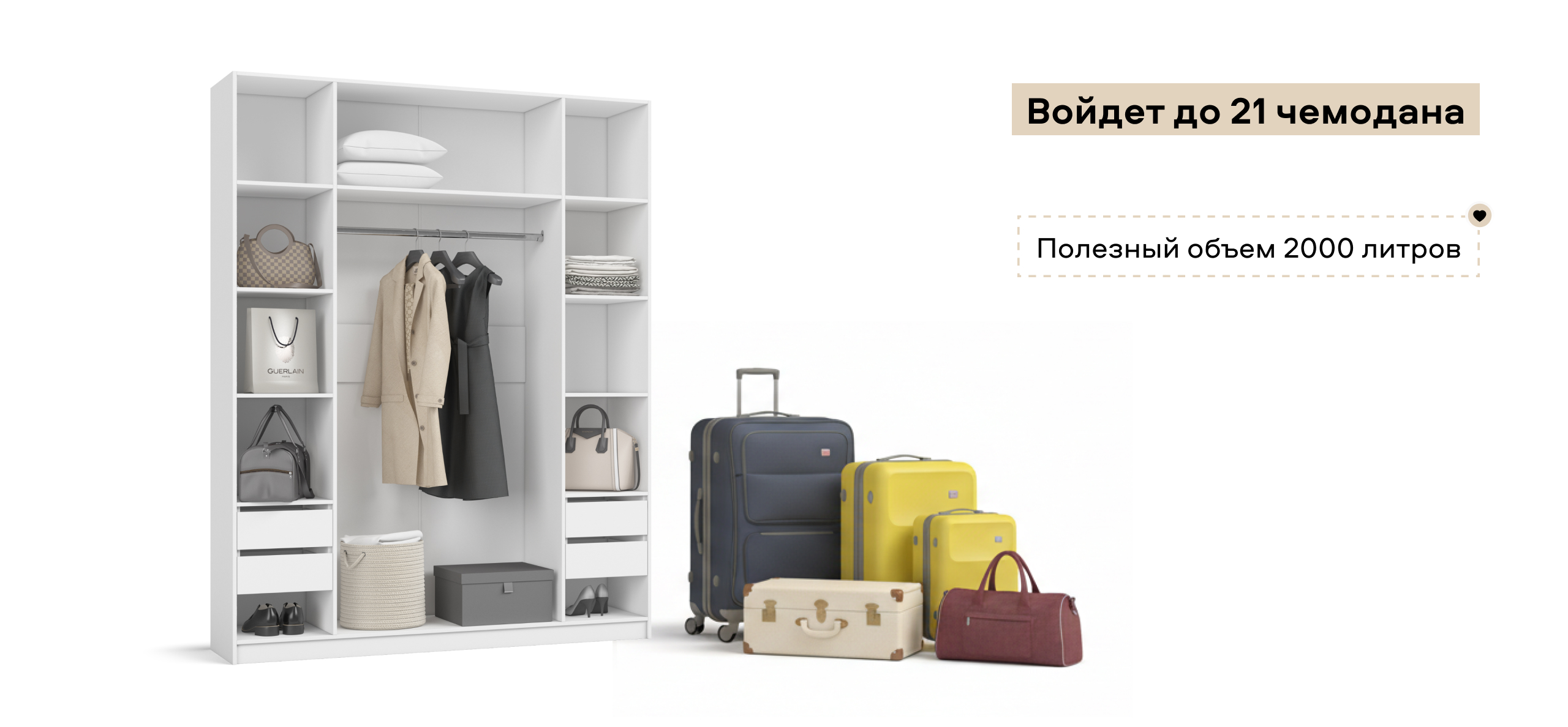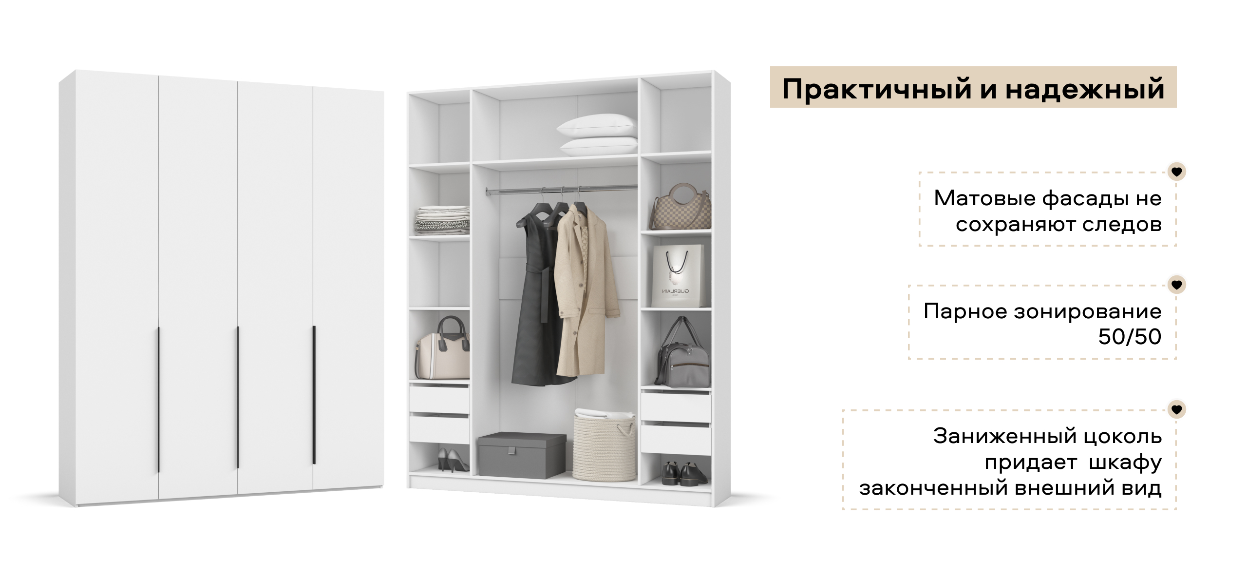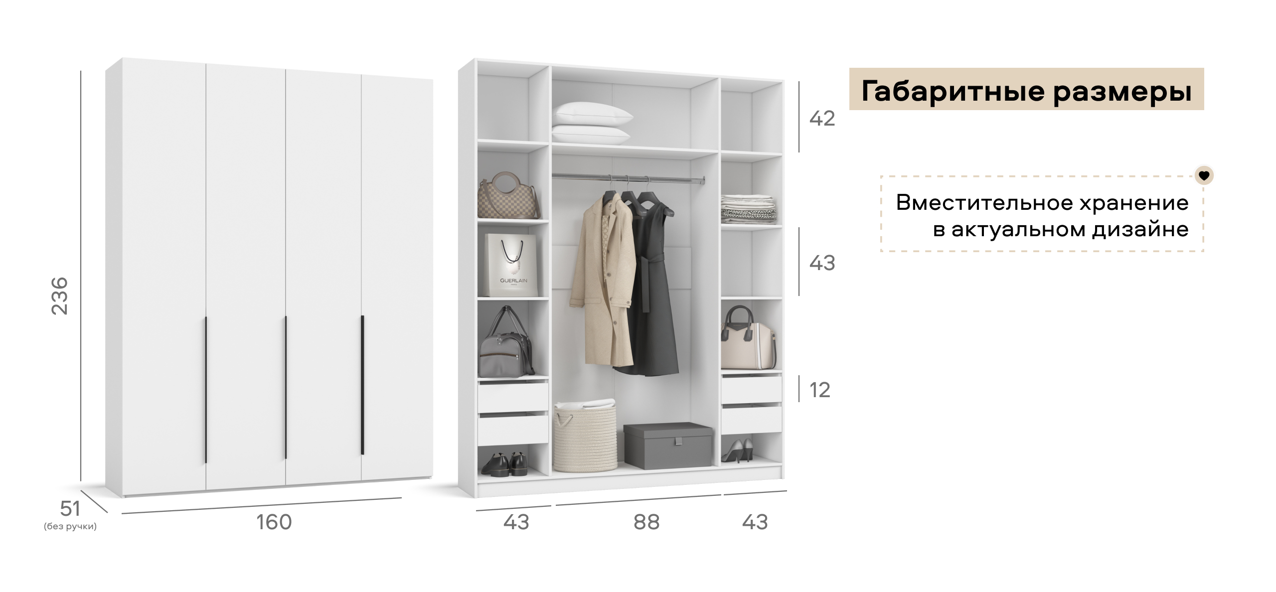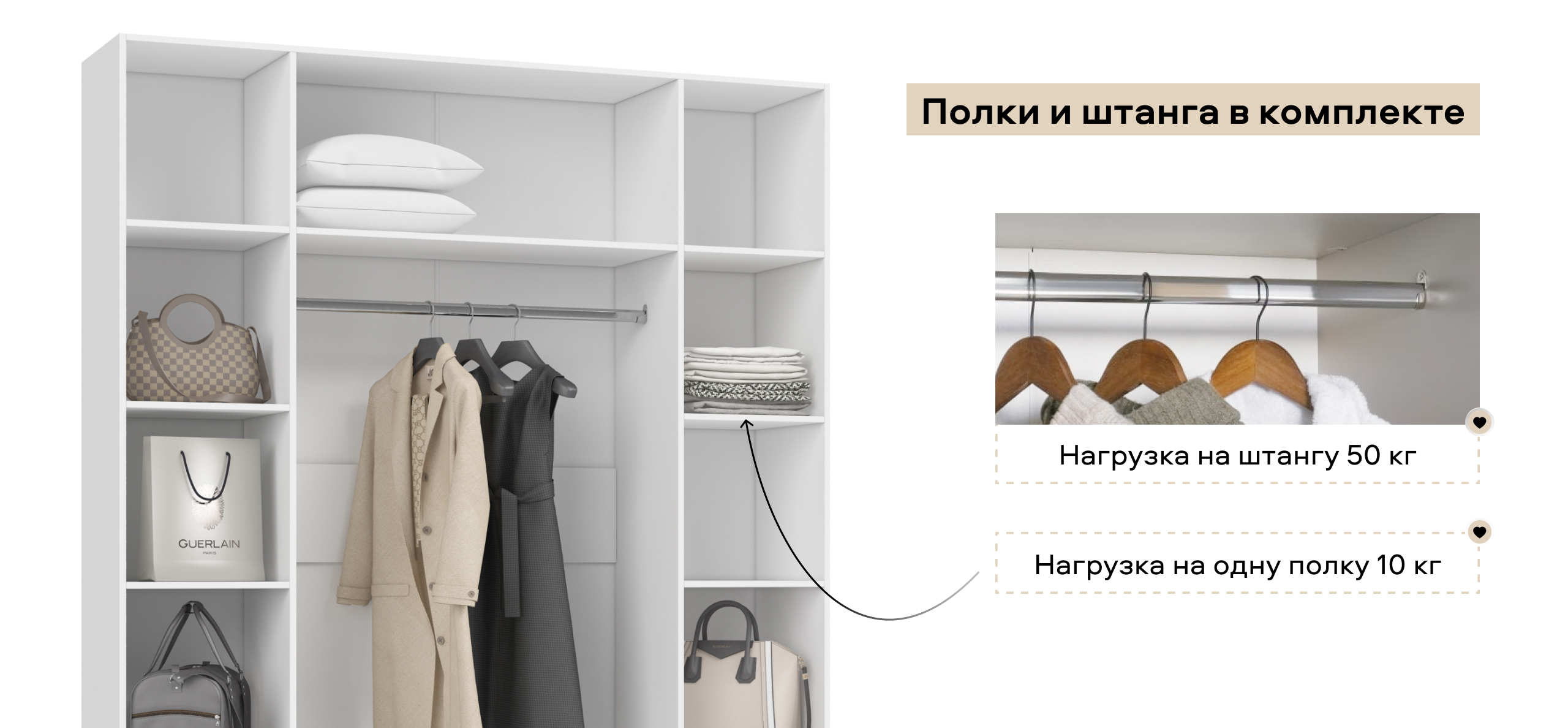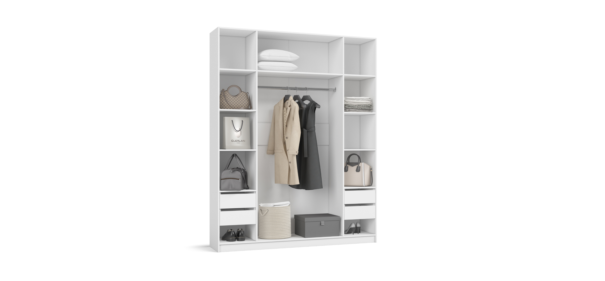 Полки и ящики можно установить с любой стороны — справа или слева. Шкаф адаптируется под вашу планировку и привычки, обеспечивая комфорт в использовании