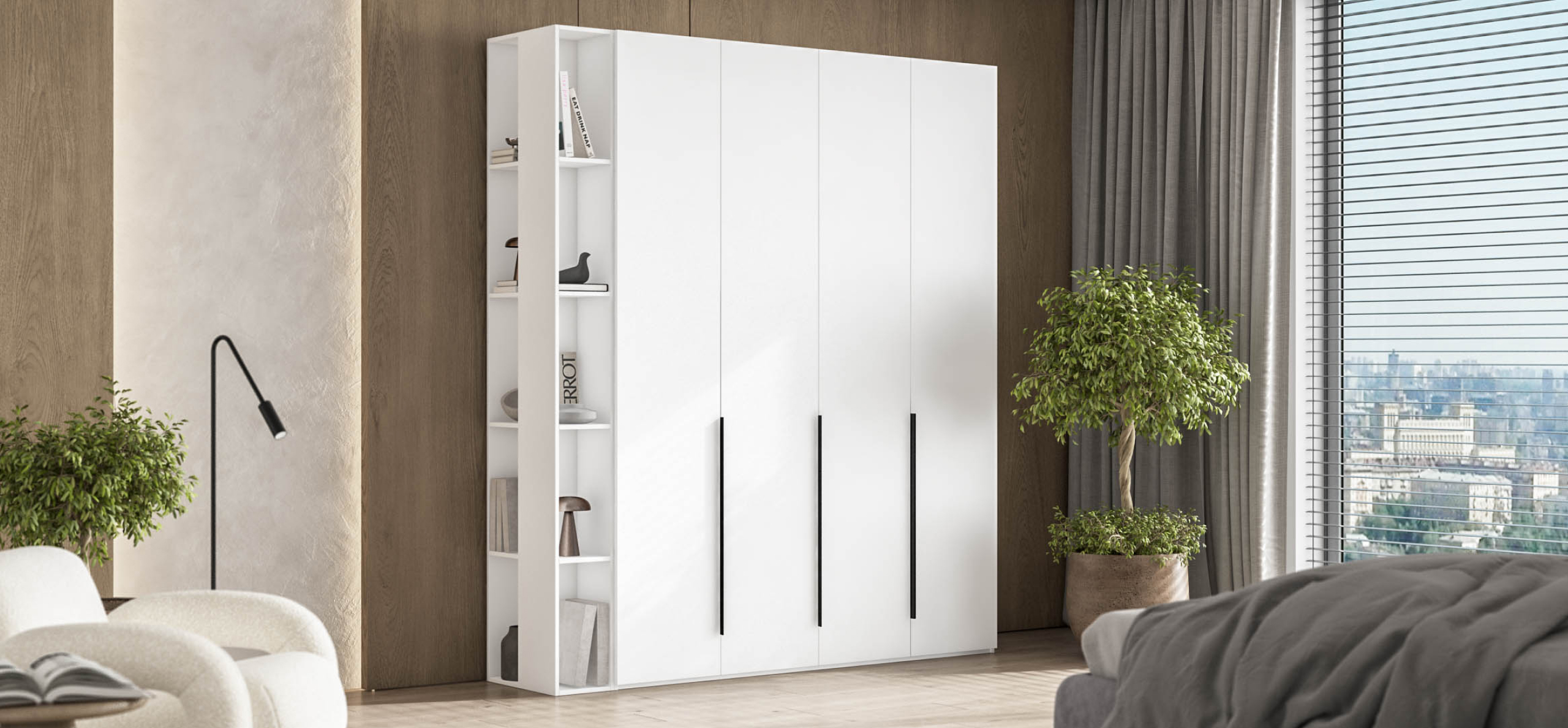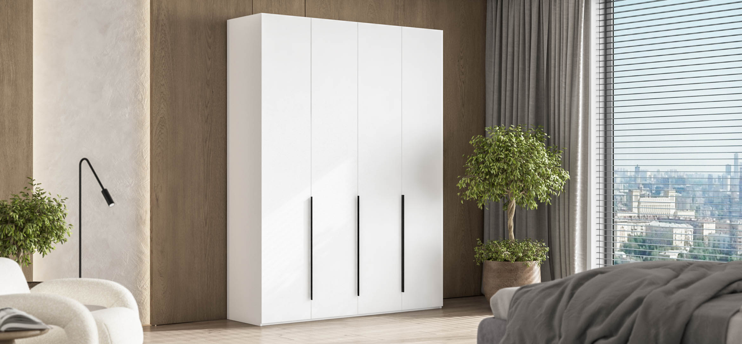 Удлинённые металлические ручки подчёркивают современный характер мебели