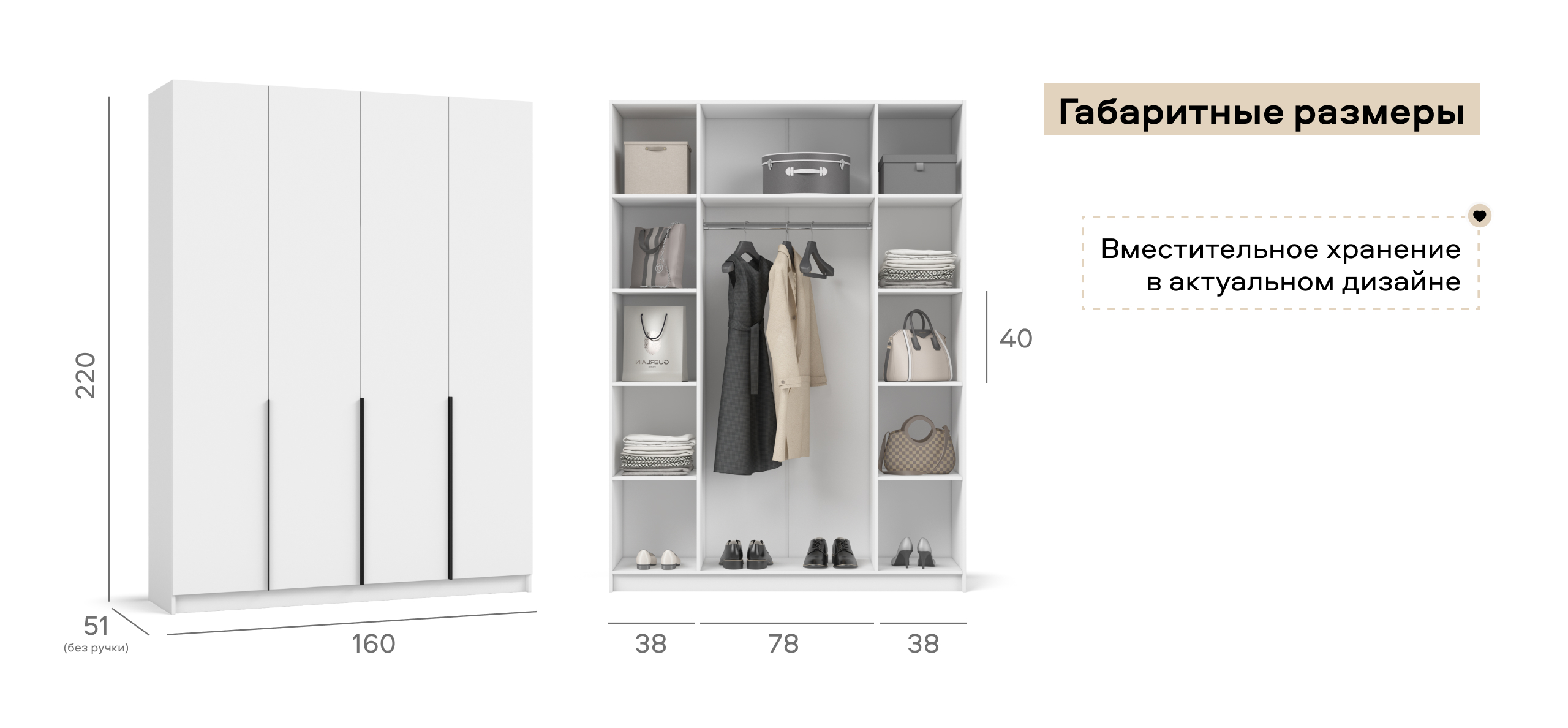 По бокам — две зеркальные секции с полками на всю высоту, в центре — штанга для длинной одежды. Полки выдерживают серьёзную нагрузку, а двери с премиальными доводчиками открываются плавно и бесшумно, поддерживая спокойный утренний ритм и избавляя от споров о «главной» стороне.