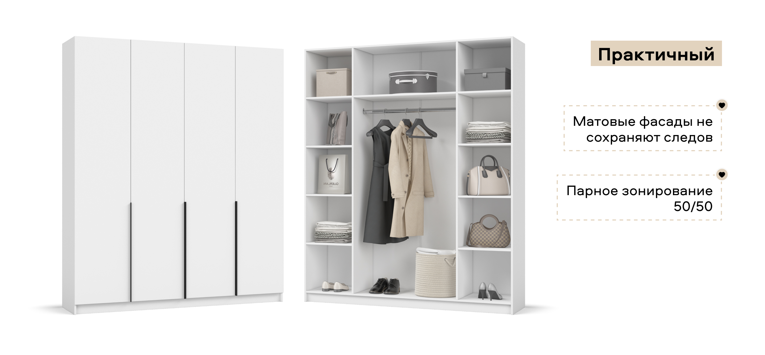 По бокам — две зеркальные секции с полками на всю высоту, в центре — штанга для длинной одежды. Полки выдерживают серьёзную нагрузку, а двери с премиальными доводчиками открываются плавно и бесшумно, ускоряя поиск вещей и избавляя от споров о «главной» стороне.
