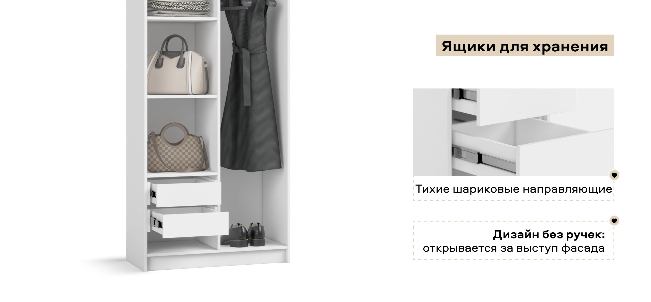 Гибкая компоновка превращает Босс Стандарт 80 в персональную систему хранения. Полки и два выдвижных ящика можно расположить справа или слева — выбирайте конфигурацию под планировку и ваши привычки. Двери с премиальными доводчиками открываются лёгким движением и закрываются мягко, поддерживая спокойный ритм утра.