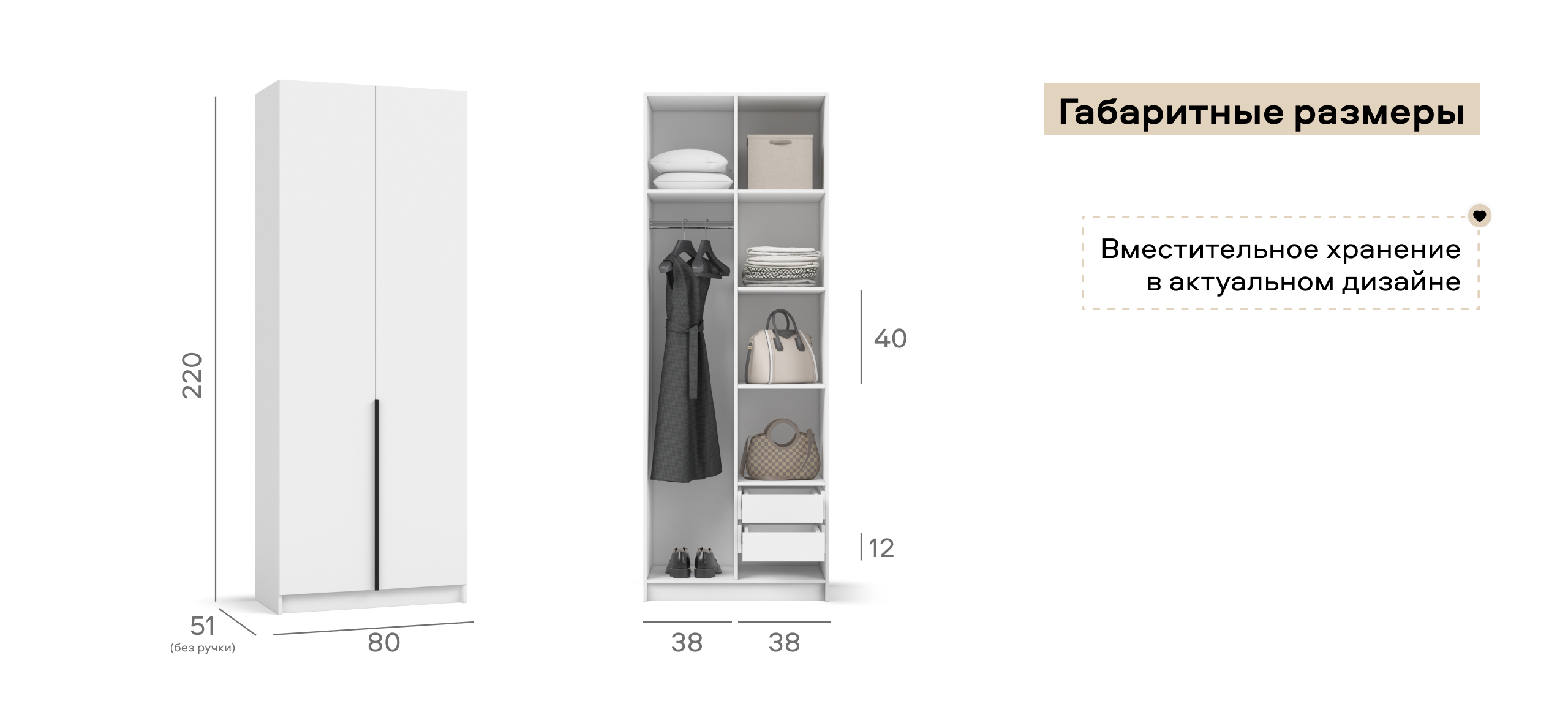 Шкаф Босс Стандарт 80 — компактное, но статусное решение для городской квартиры: хранить всё нужное, оставляя максимум свободного пространства. Лаконичный фасад с удлинёнными чёрными ручками отвечает эстетике 2025 года и становится ярким акцентом любого интерьера — от сканди до неоклассики. Каждый сантиметр внутри задействован: базовый гардероб, коробки с обувью и текстиль размещаются упорядоченно, освобождая комнату от визуального шума.