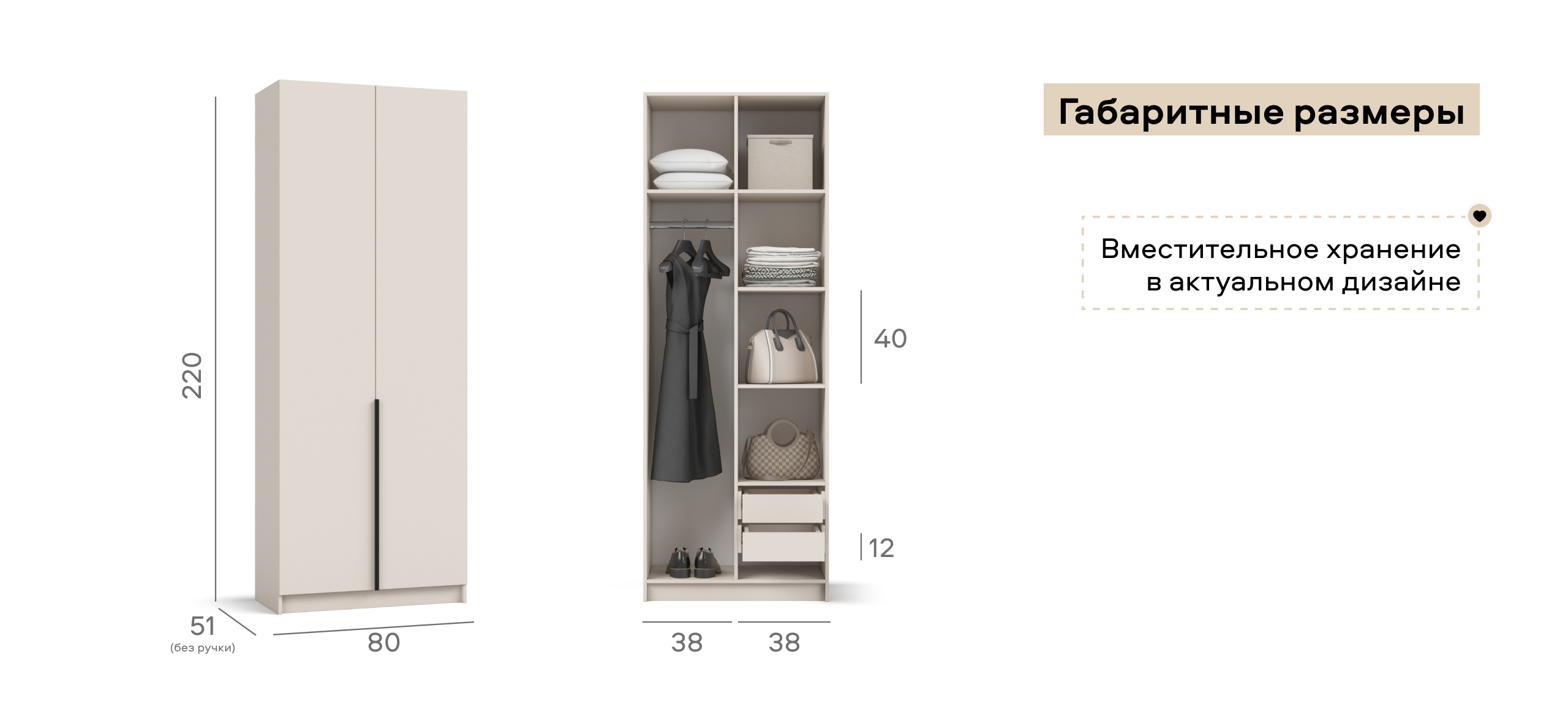 Шкаф Босс Стандарт 80 — компактное, но статусное решение для городской квартиры: хранить всё нужное, оставляя максимум свободного пространства. Лаконичный фасад с удлинёнными чёрными ручками отвечает эстетике 2025 года и становится ярким акцентом любого интерьера — от сканди до неоклассики. Каждый сантиметр внутри задействован: базовый гардероб, коробки с обувью и текстиль размещаются упорядоченно, освобождая комнату от визуального шума.