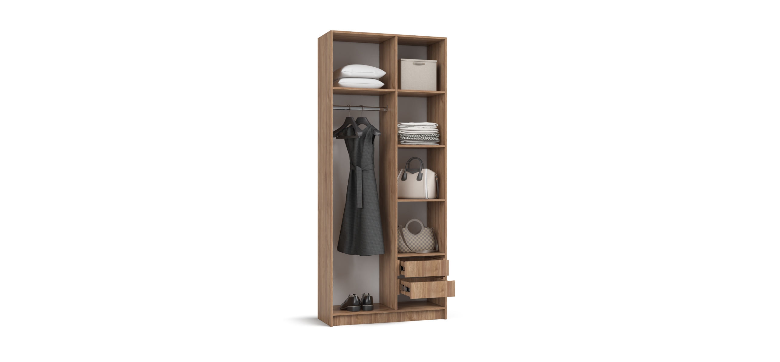 Гибкая компоновка превращает Босс Стандарт 90 в персональный конструктор хранения. Полки и два выдвижных ящика можно установить справа или слева — как подсказывает планировка и ваши привычки. Двери с доводчиками открываются лёгким движением и закрываются мягко; ящики на шариковых направляющих выдвигаются плавно и бесшумно, не нарушая утренний ритм.