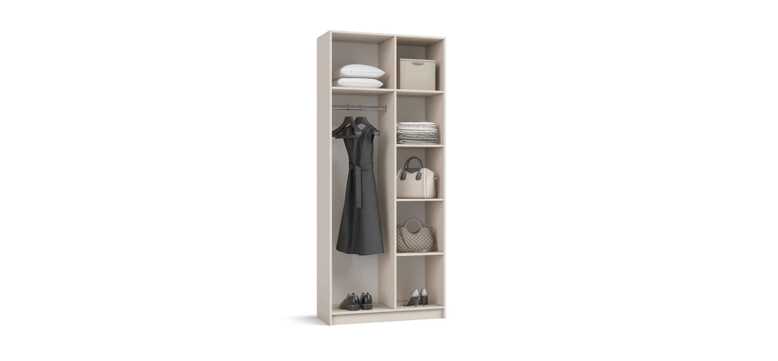 Гибкая компоновка превращает Босс Стандарт 90 в персональную систему хранения. Переставляемые полки можно расположить на нужной высоте — под планировку комнаты и ваши привычки. Двери с премиальными доводчиками открываются лёгким движением и закрываются мягко, не нарушая утренний ритм.