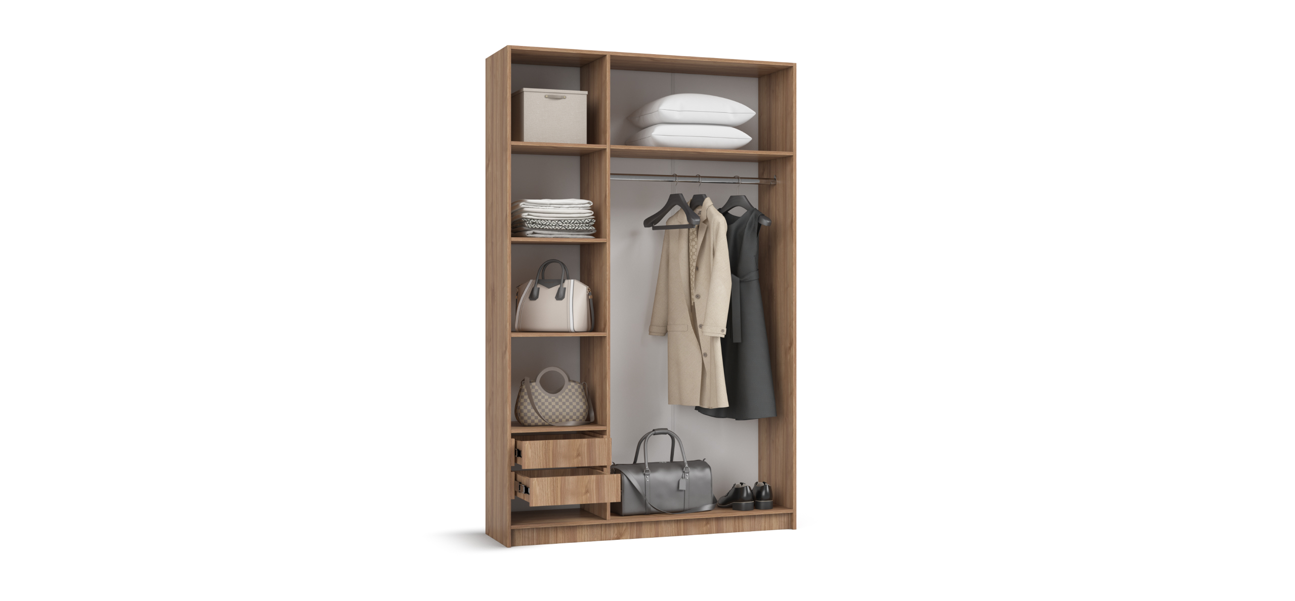 Гибкая компоновка превращает Рим 135 в личный конструктор хранения. Полки и два выдвижных ящика можно установить либо справа, либо слева — под планировку комнаты и ваши привычки. Ящики на шариковых направляющих выдвигаются плавно и бесшумно, а створки открываются лёгким движением, не отвлекая от утренней рутины.