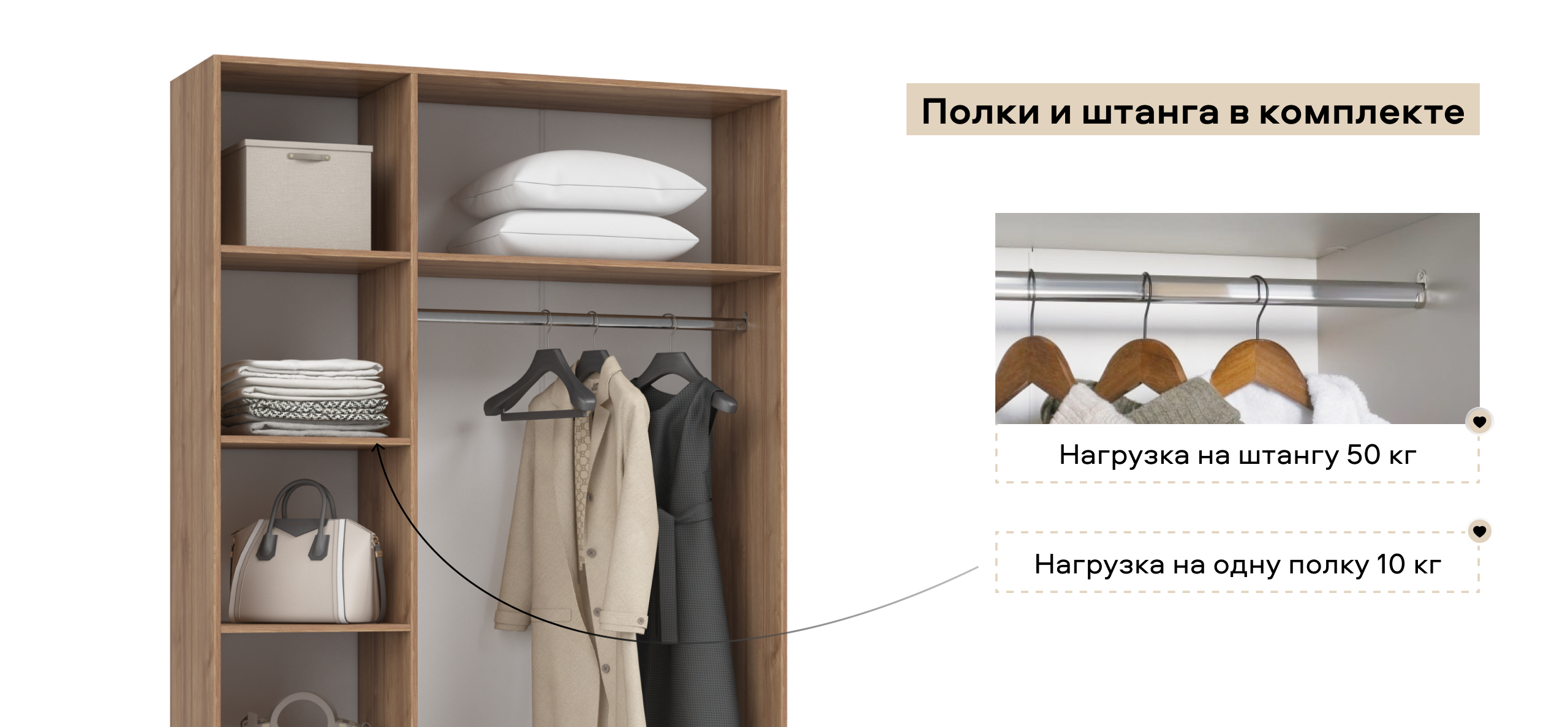 Полки и ящики можно установить с любой стороны — справа или слева. Шкаф адаптируется под вашу планировку и привычки, обеспечивая комфорт в использовании