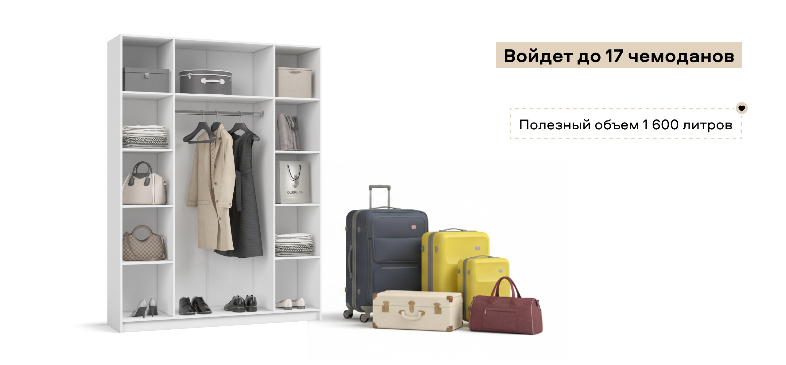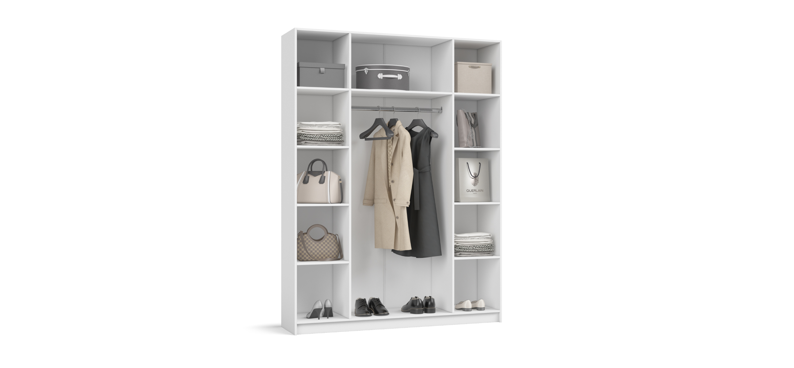 По бокам — две симметричные секции с полками на всю высоту, а в центре — штанга для длинной одежды. Такая компоновка экономит время на поиск вещей и избавляет от необходимости выбирать, какая сторона «главная». Полки выдерживают серьёзную нагрузку, а створки открываются плавным движением, не нарушая утренний ритм.