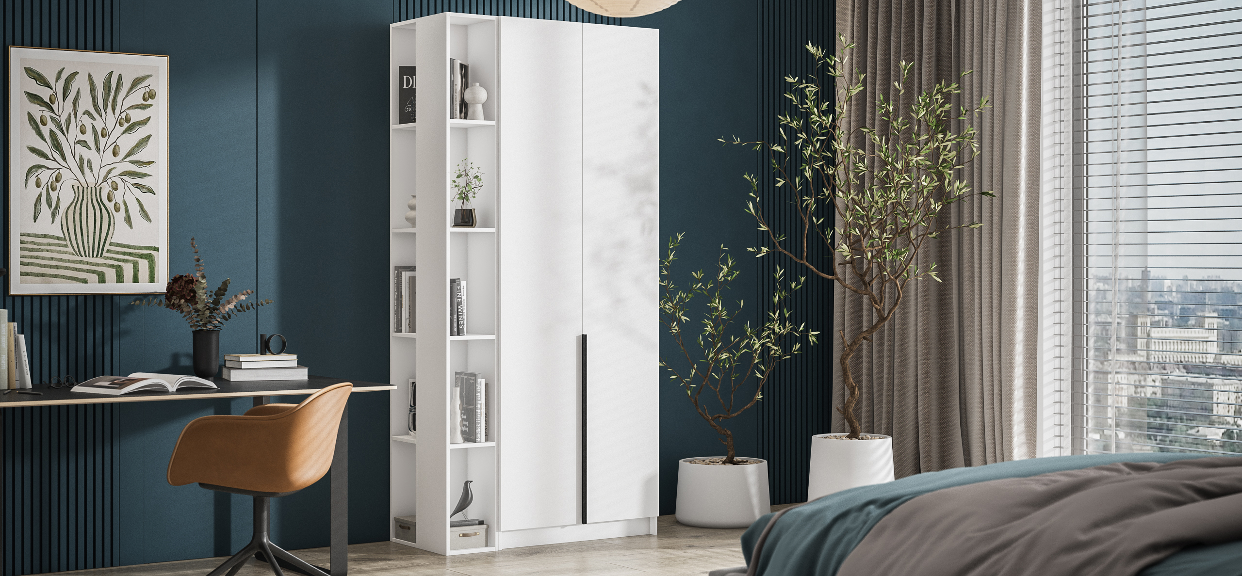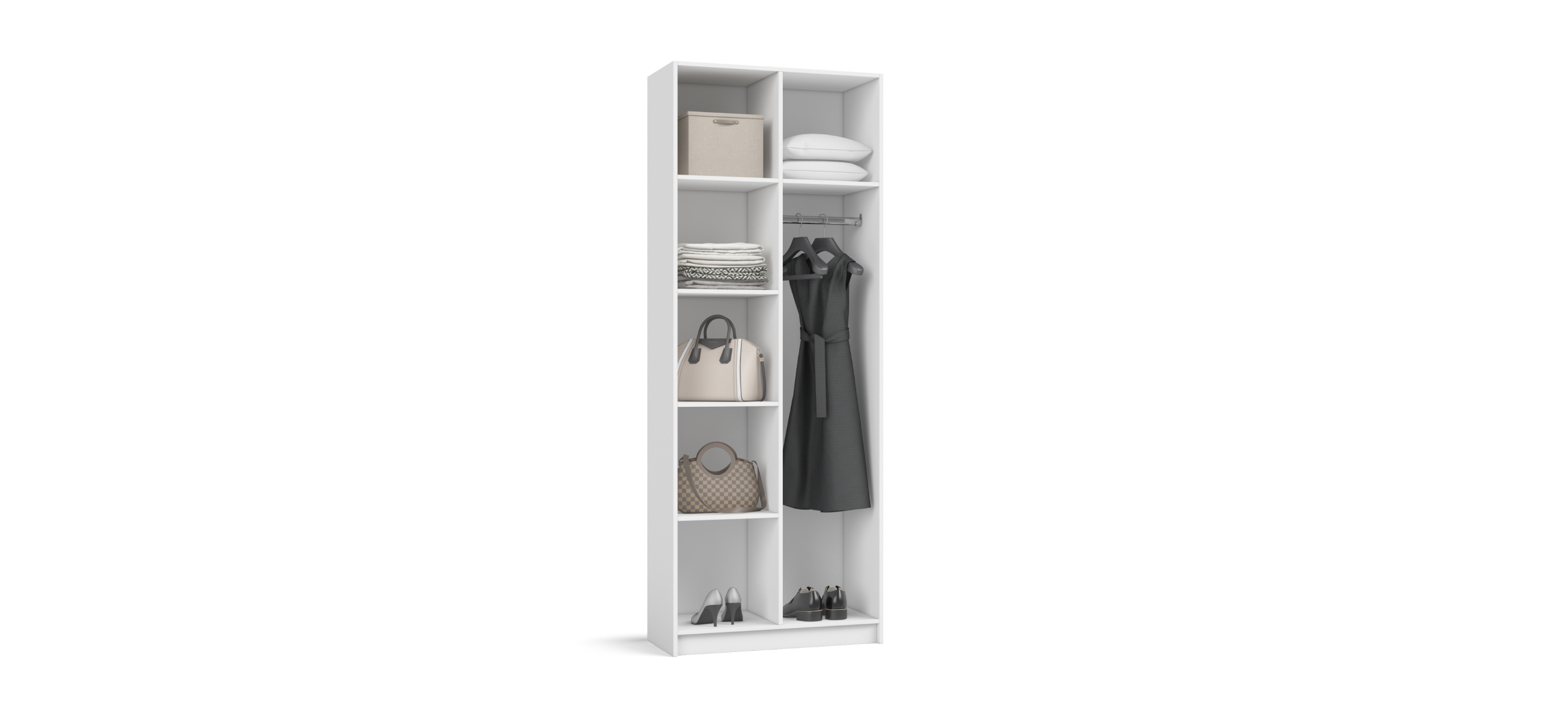 Продуманная компоновка превращает Рим 80 в персональную систему хранения. Полки и два выдвижных ящика можно расположить либо справа, либо слева — выбирайте вариант, который лучше подходит планировке комнаты и вашим привычкам. Двери открываются лёгким движением и двигаются тихо, не нарушая утренний ритм.