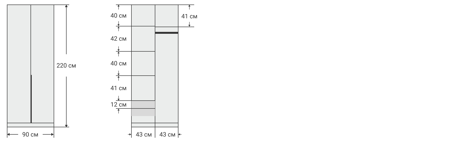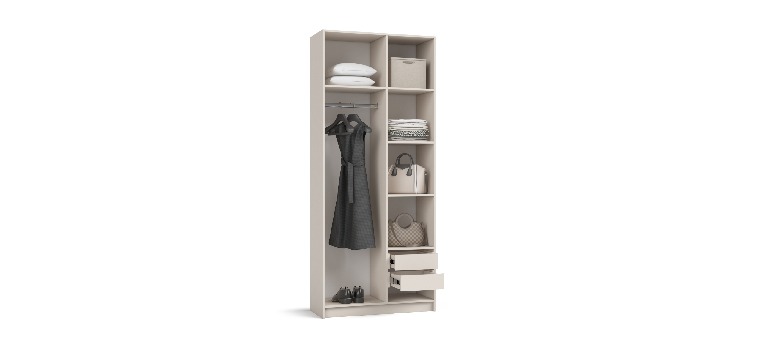 Полки и ящики можно установить с любой стороны — справа или слева. Шкаф адаптируется под вашу планировку и привычки, обеспечивая комфорт в использовании