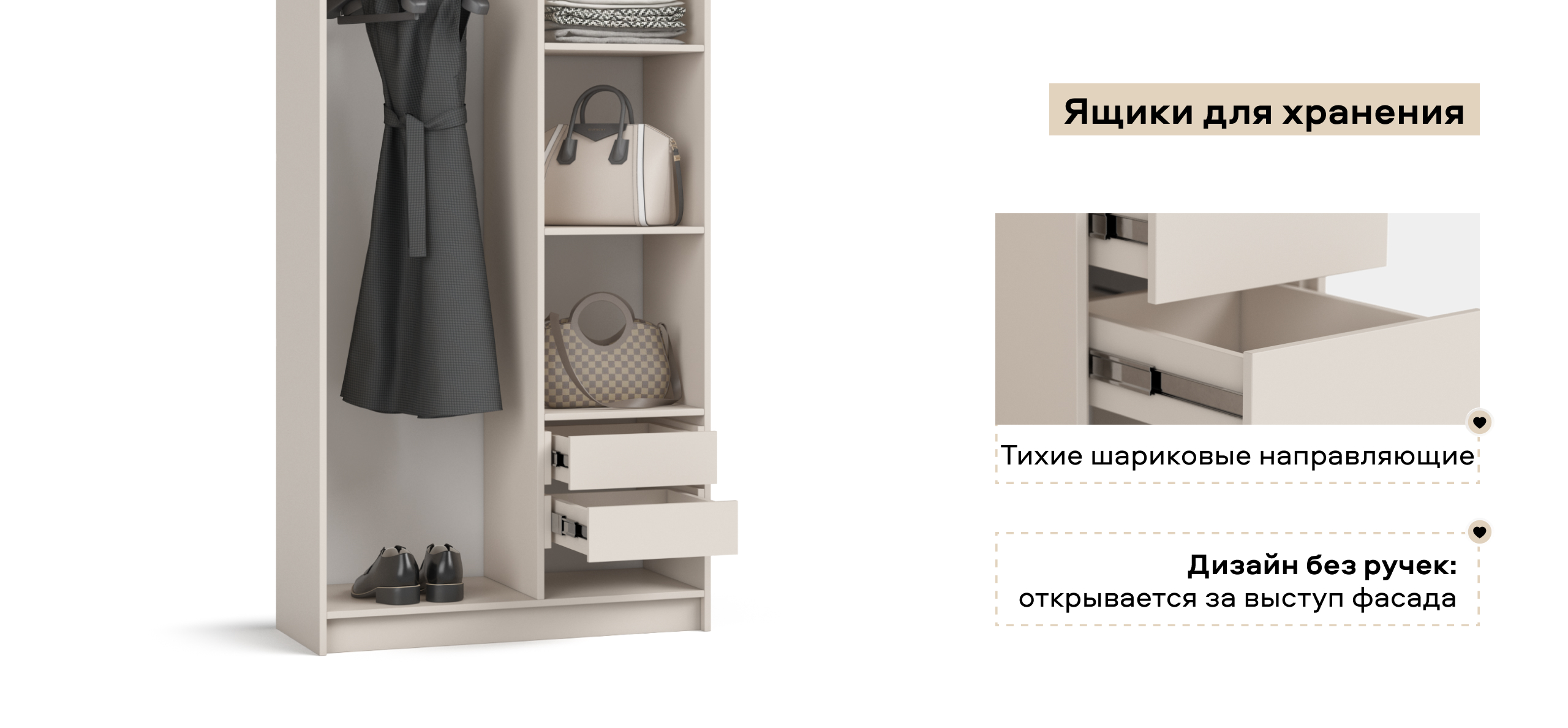Ящики на шариковых направляющих Плавное и надёжное выдвижение даже при полной загрузке. Удобное решение для повседневного хранения без компромиссов