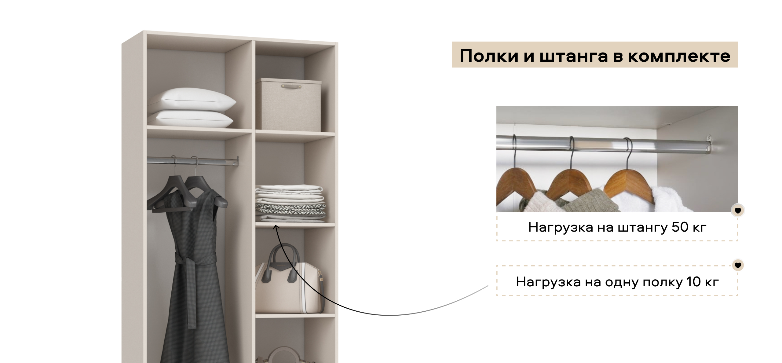 Полки и ящики можно установить с любой стороны — справа или слева. Шкаф адаптируется под вашу планировку и привычки, обеспечивая комфорт в использовании