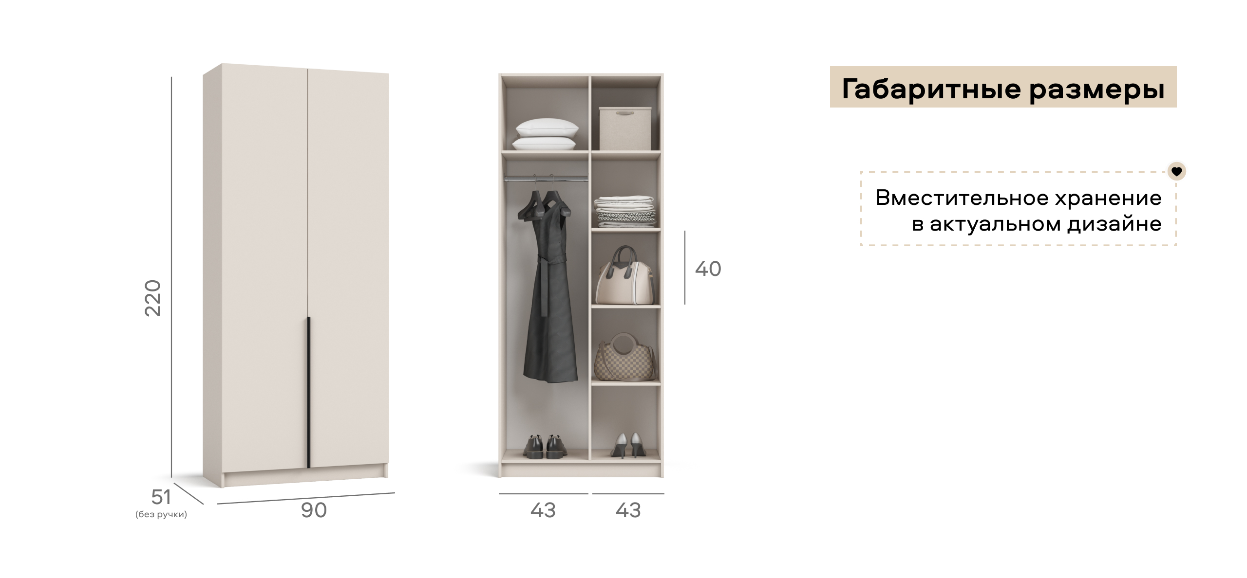 Шкаф Рим 90 — компактный ответ на главный запрос городской квартиры: хранить нужное, сохраняя максимум свободного пространства. Лаконичный фасад с удлинёнными чёрными ручками отсылает к актуальной эстетике 2025 года и делает шкаф ярким акцентом любого интерьера — от сканди до неоклассики. Внутри продуман каждый сантиметр: аккуратное отделение легко принимает базовый гардероб, коробки с обувью и текстиль, поддерживая порядок и избавляя комнату от лишних вещей.