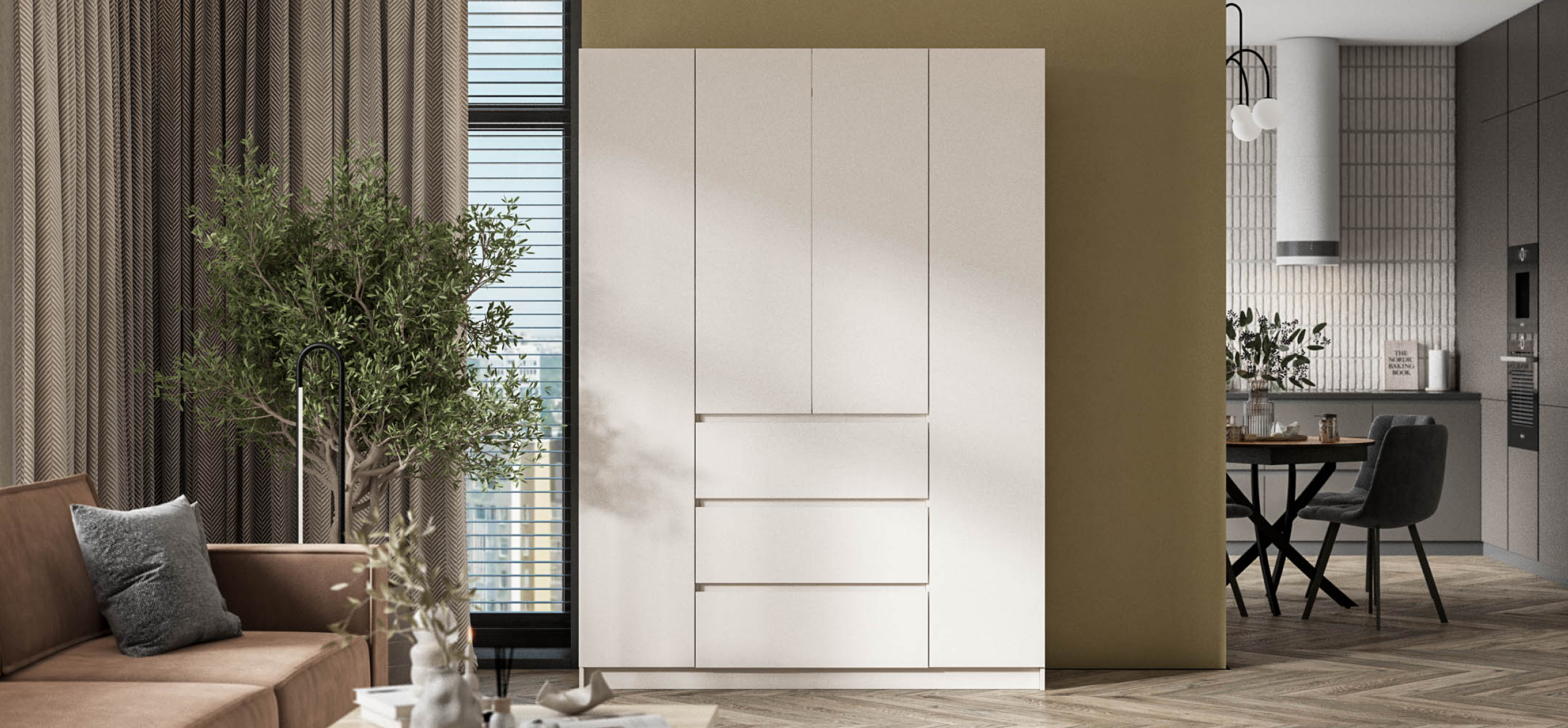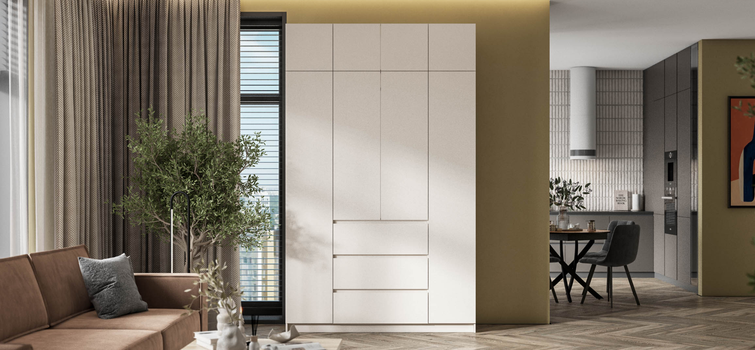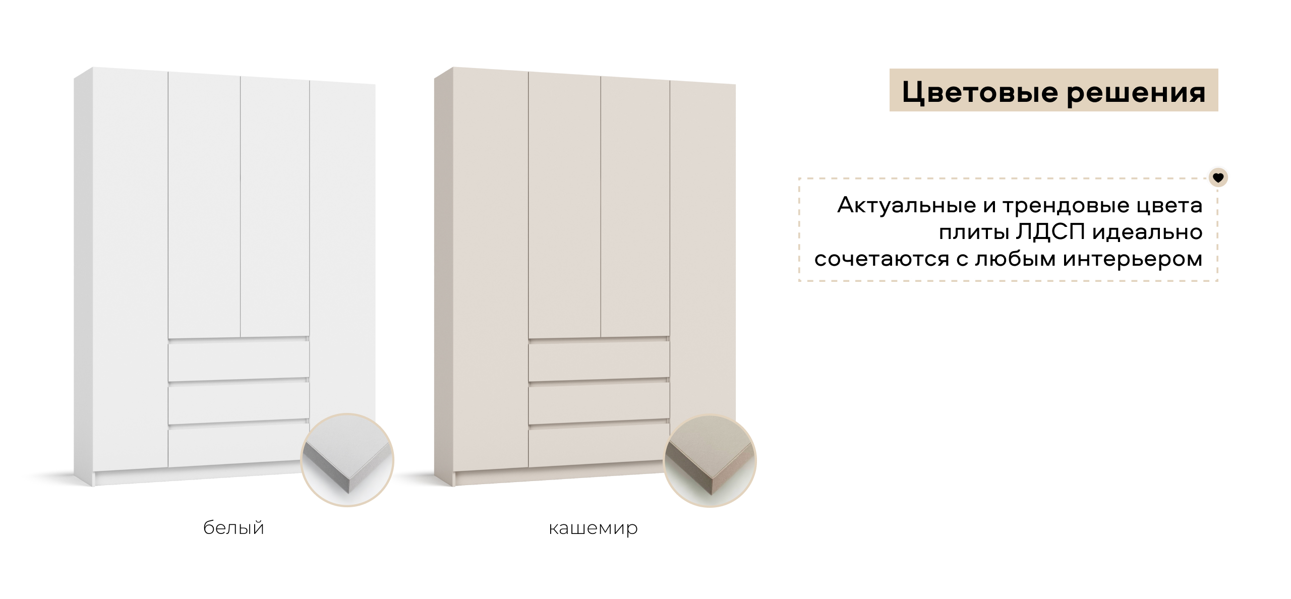 Два оттенка — тёплый Кашемир и светлый Белый — легко встраиваются в сценарии современной квартиры: от спокойного минимализма до мягкой неоклассики. Итог — ощущение упорядоченности и воздуха, когда всё на своём месте и всё под рукой.