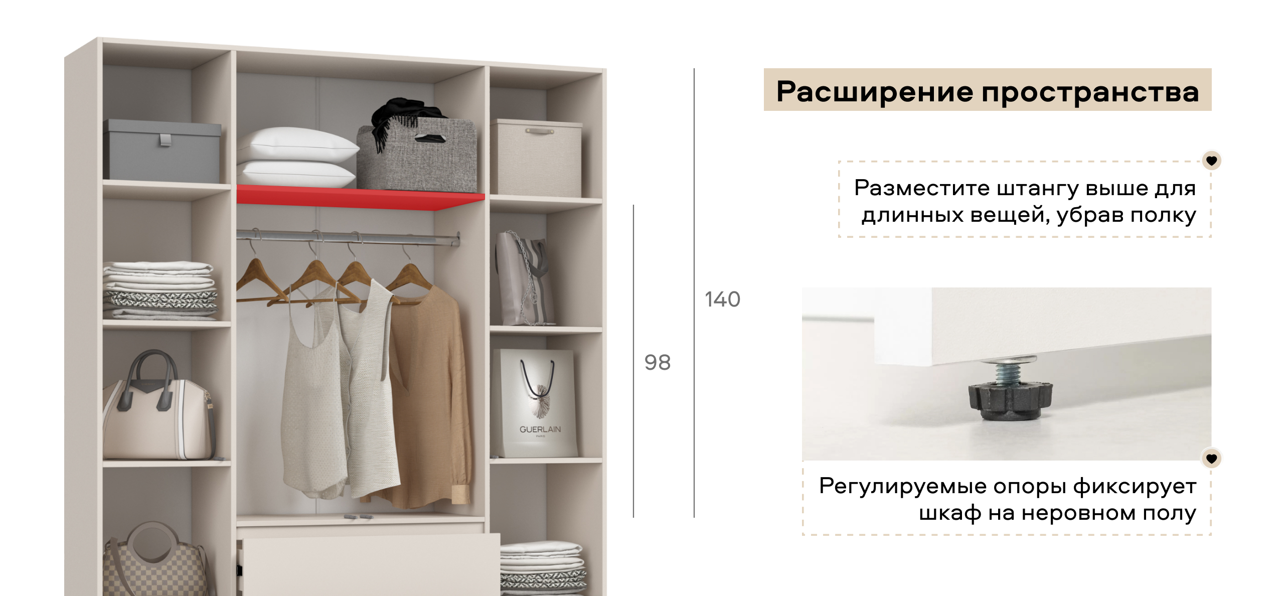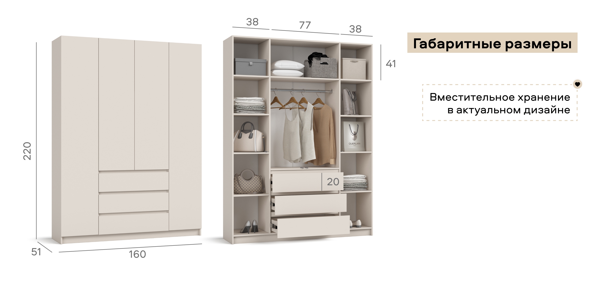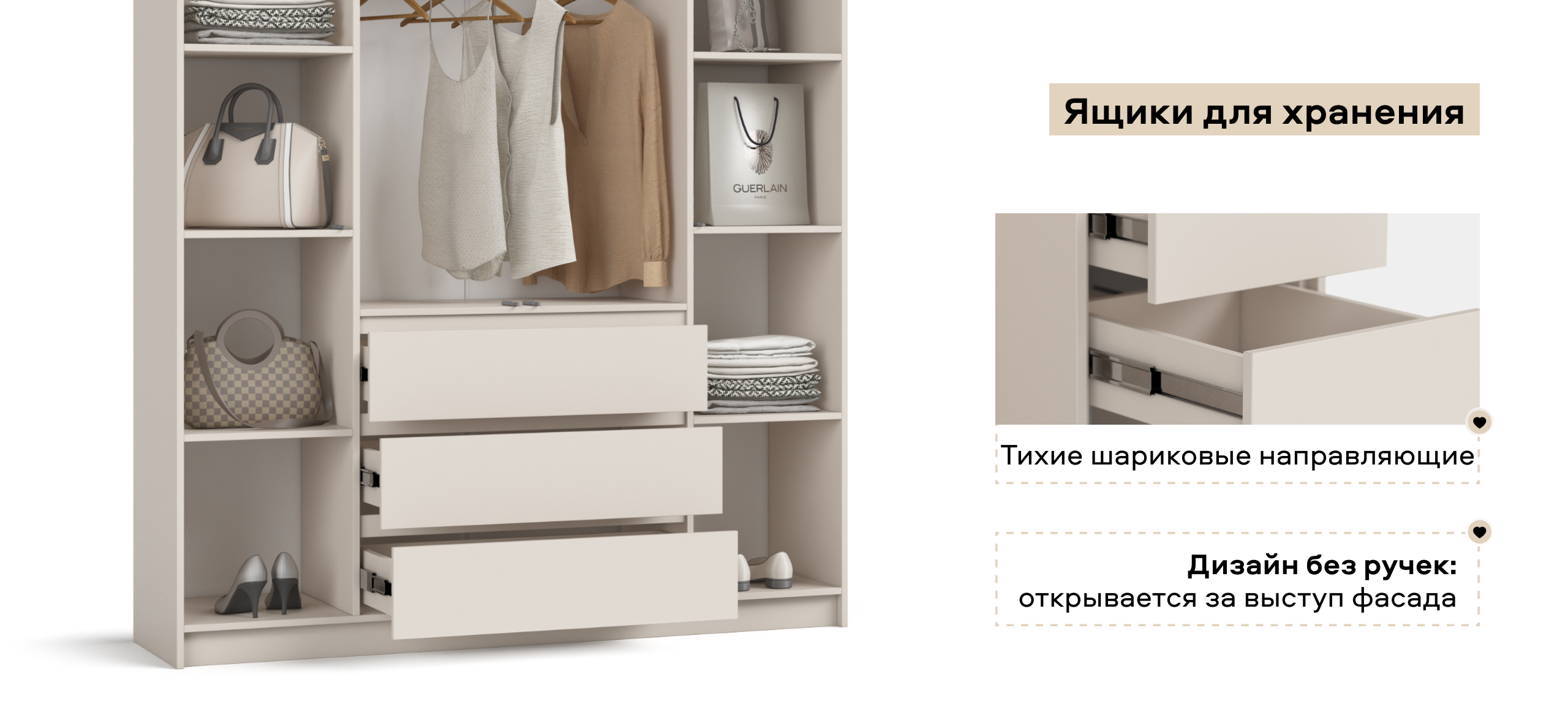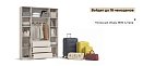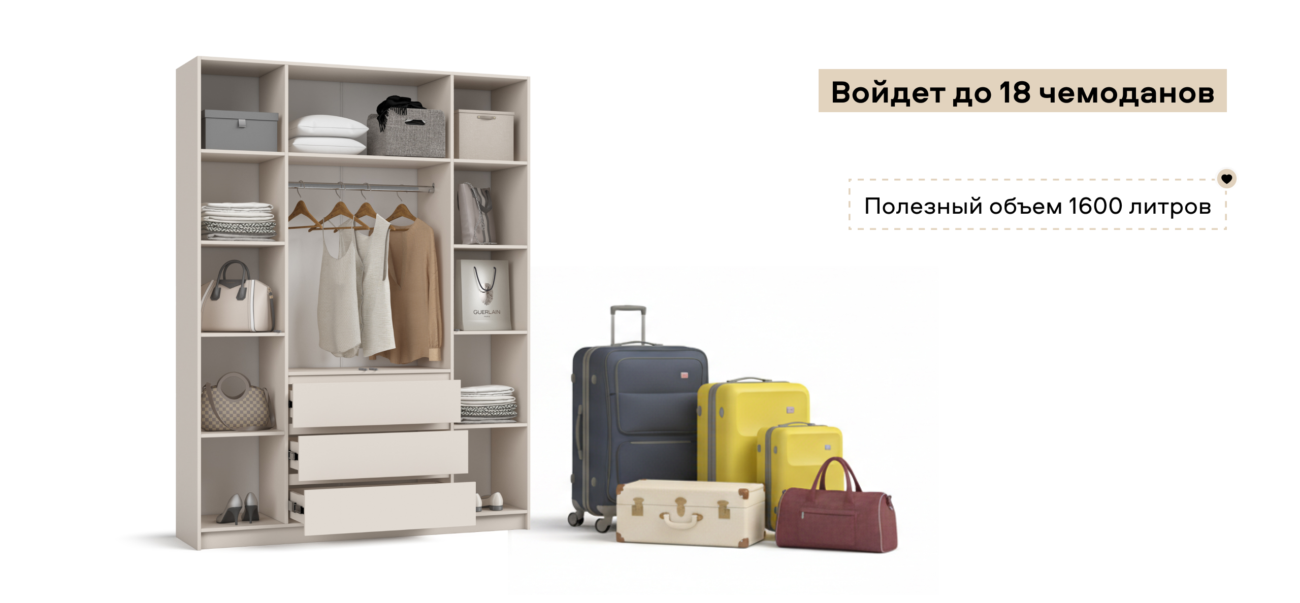 Когда руки заняты — лёгкое касание, и дверь мягко поддаётся. Внутри — ясная логика хранения: блок выдвижных ящиков работает как «мини-комод», помогает быстро разложить бельё и мелочи, а основной объём уверенно берёт на себя содержимое 18 крупных чемоданов — гардероб, обувные коробки, постельное.