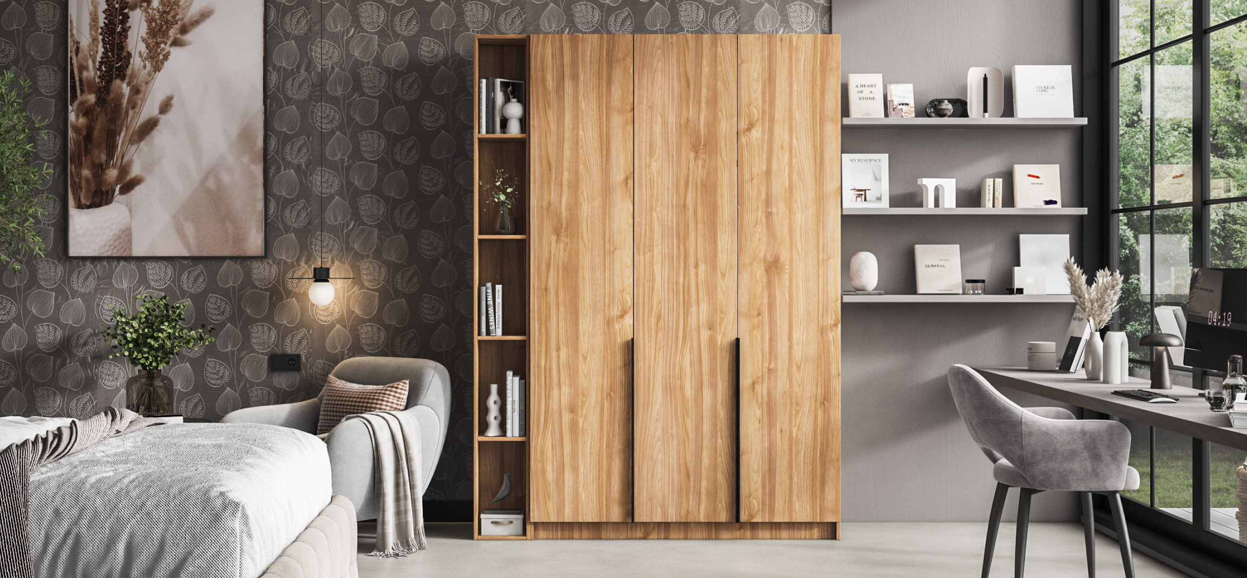 Модульное решение расширяет систему хранения без увеличения глубины и визуального веса, завершая композицию и придавая интерьеру законченный, гармоничный вид.