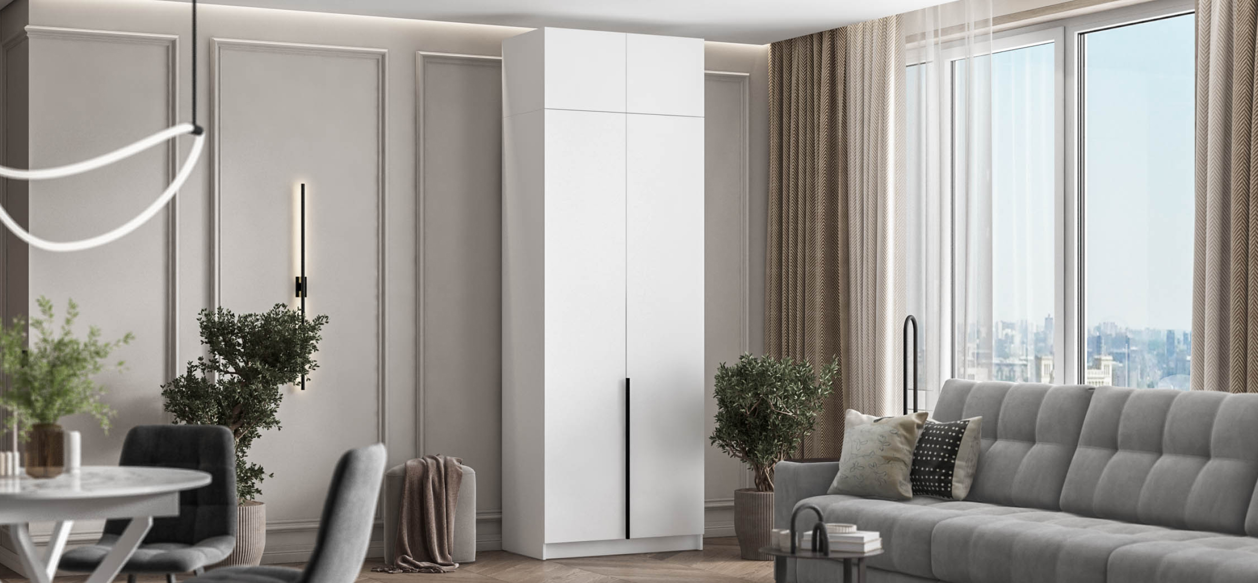 Открывайте фасады лёгким касанием — скрытые толкатели работают бесшумно, даря ощущение заботы о каждом жесте. Храните книги, декор или сезонные аксессуары так, чтобы они радовали глаз, а не собирали пыль.