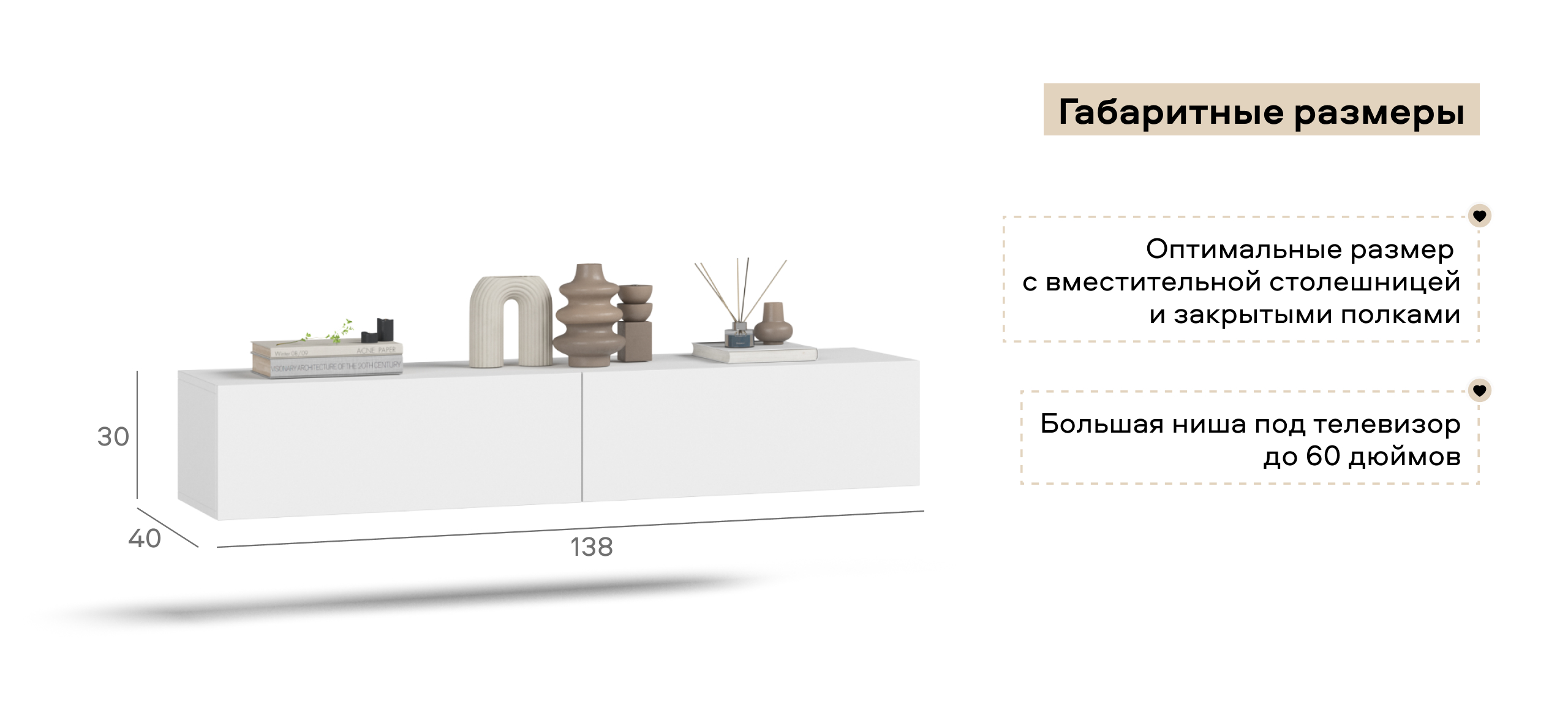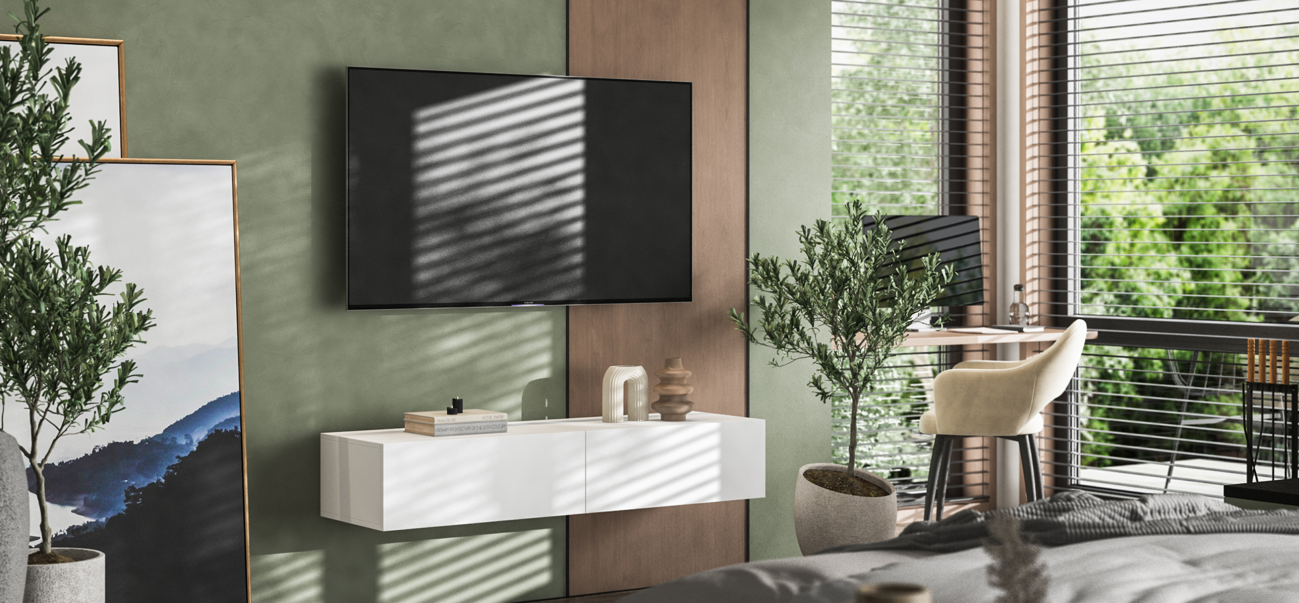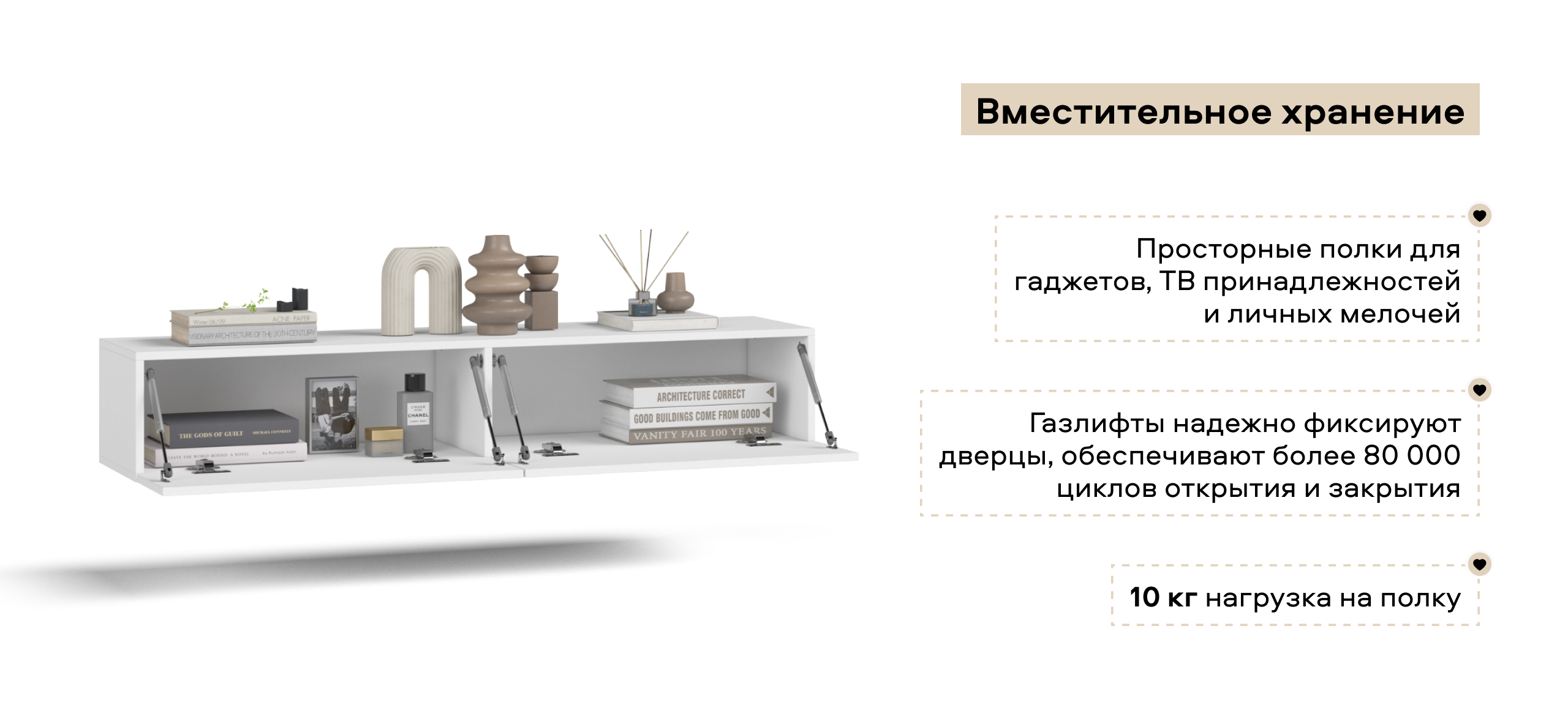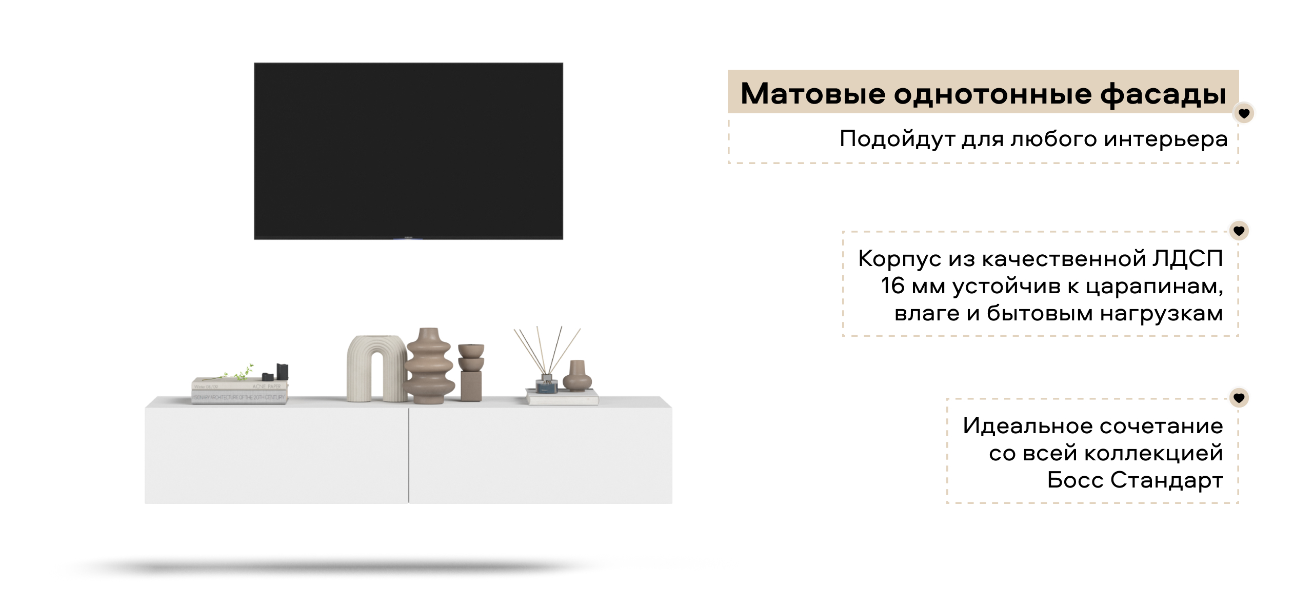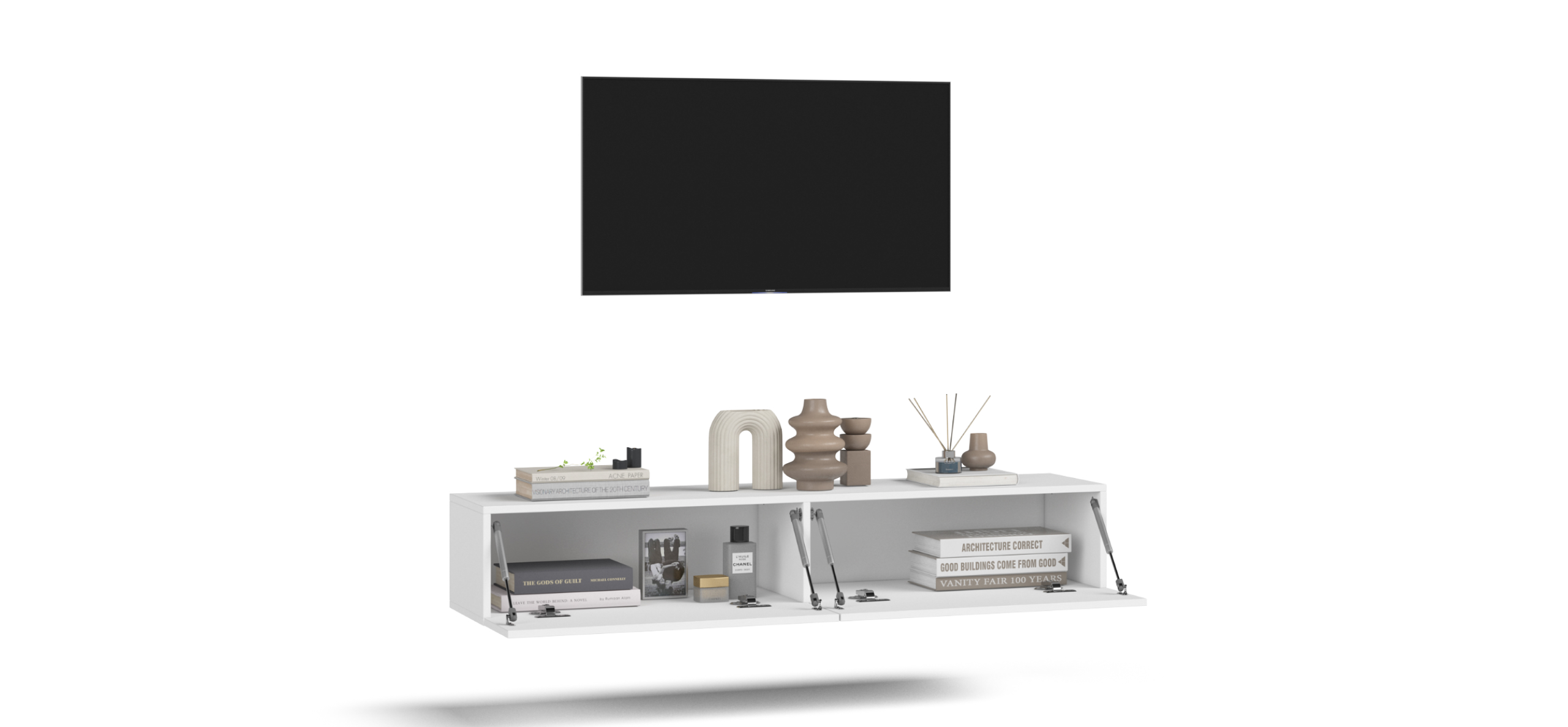 Вместительная ТВ тумба BOSS STANDART 140 с полностью закрытым хранением идеально подходит для хранения личных вещей, ТВ аксессуаров. Тумба оснащена фасадом с подъёмным механизмом, который плавно и бесшумно откидывается вниз, образуя доступ ко всему внутреннему пространству. ТВ Тумба оснащена системой Push-to –open, которая обеспечит легкое открывание дверцы одним нажатием.