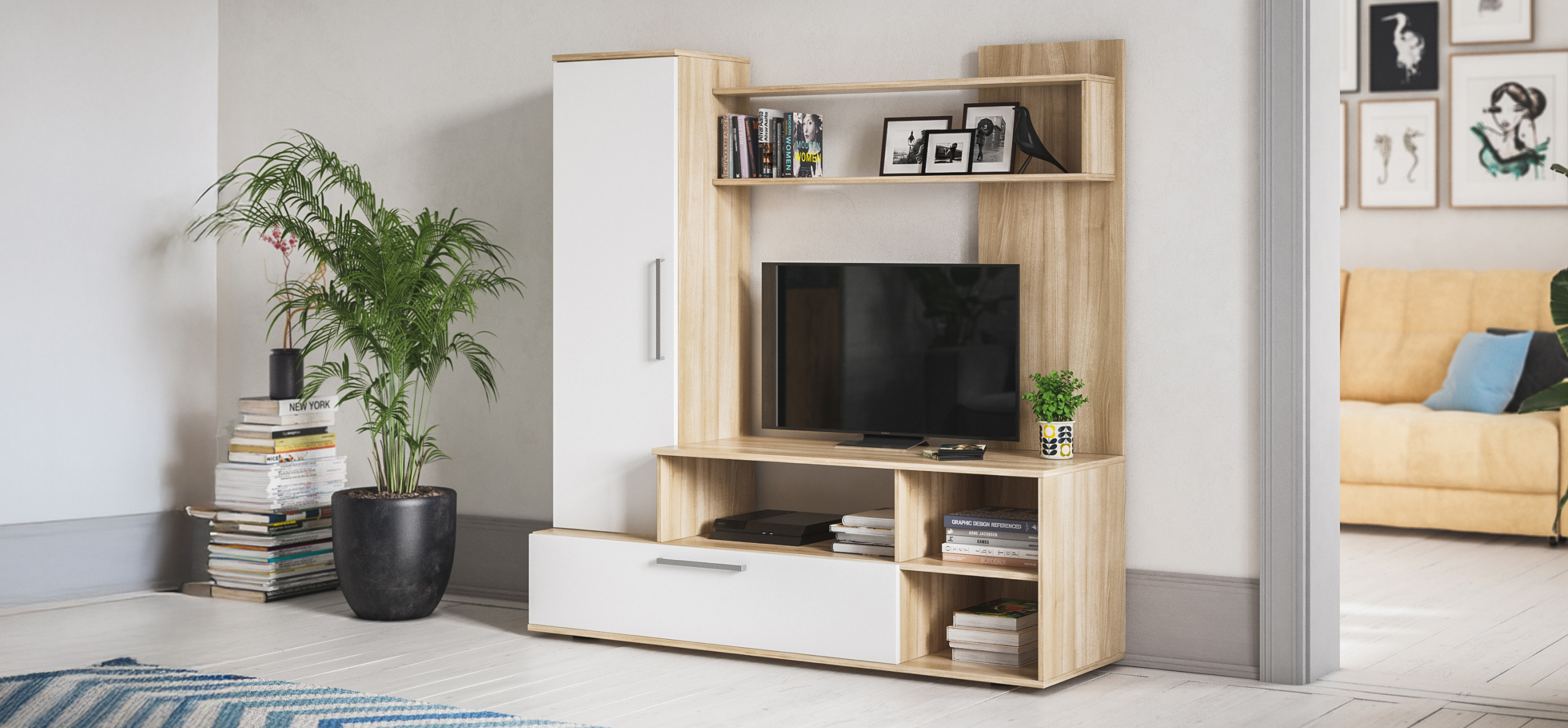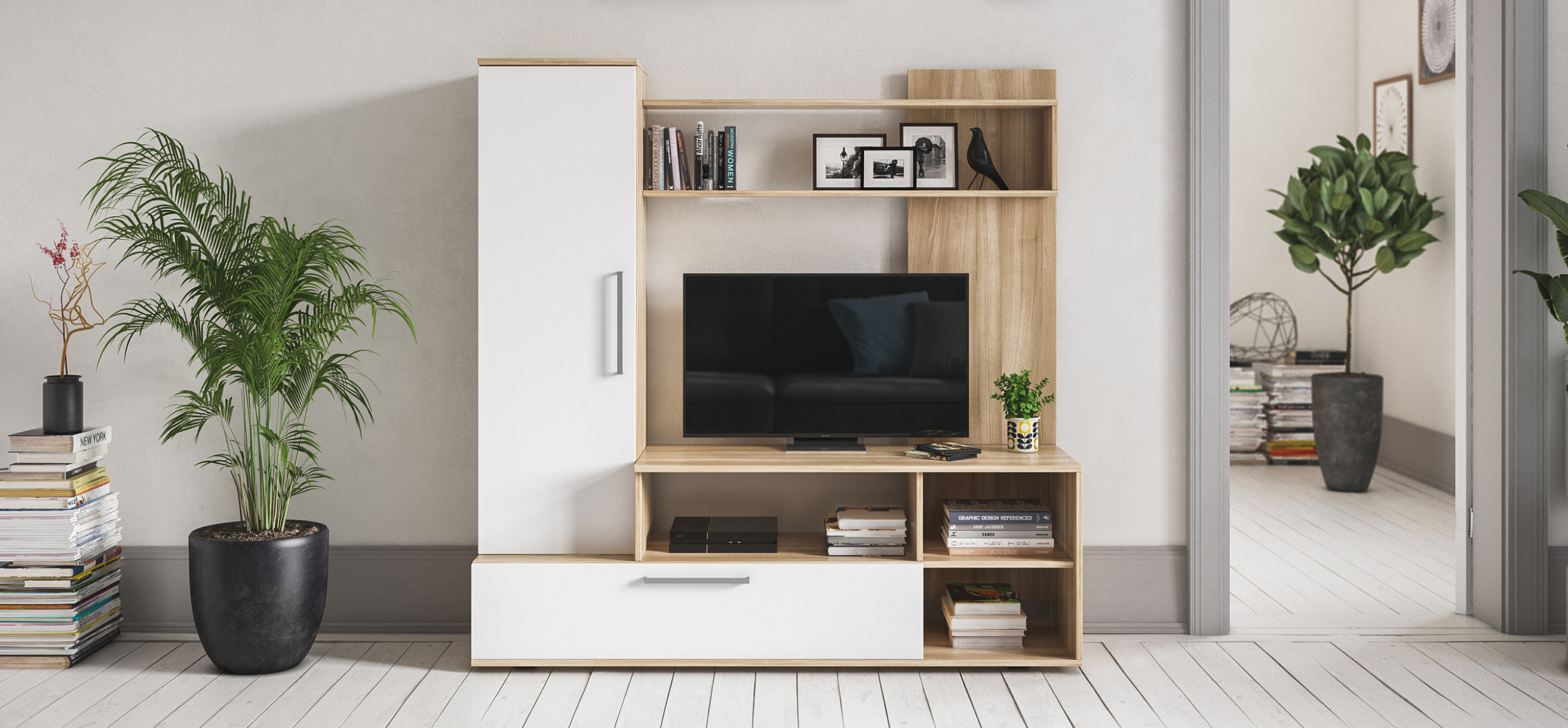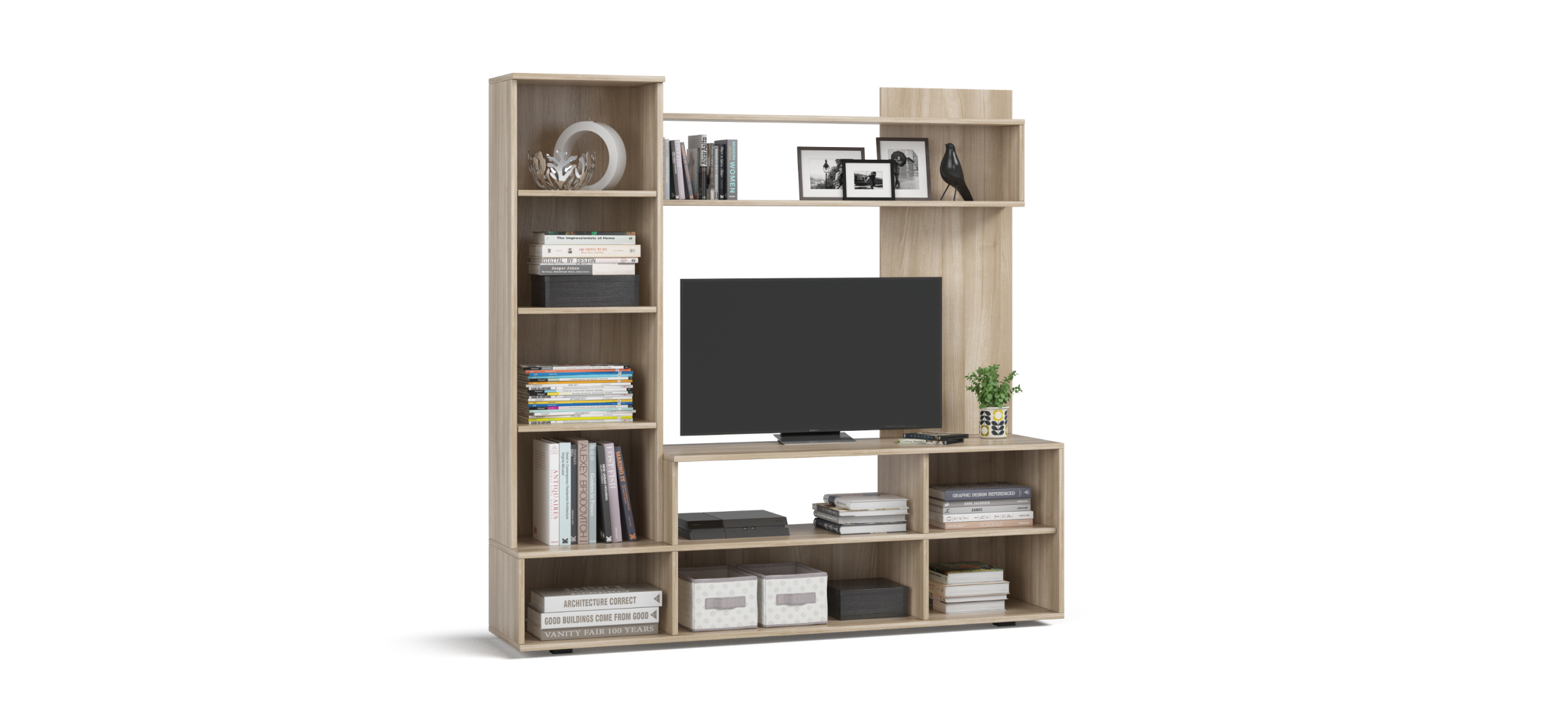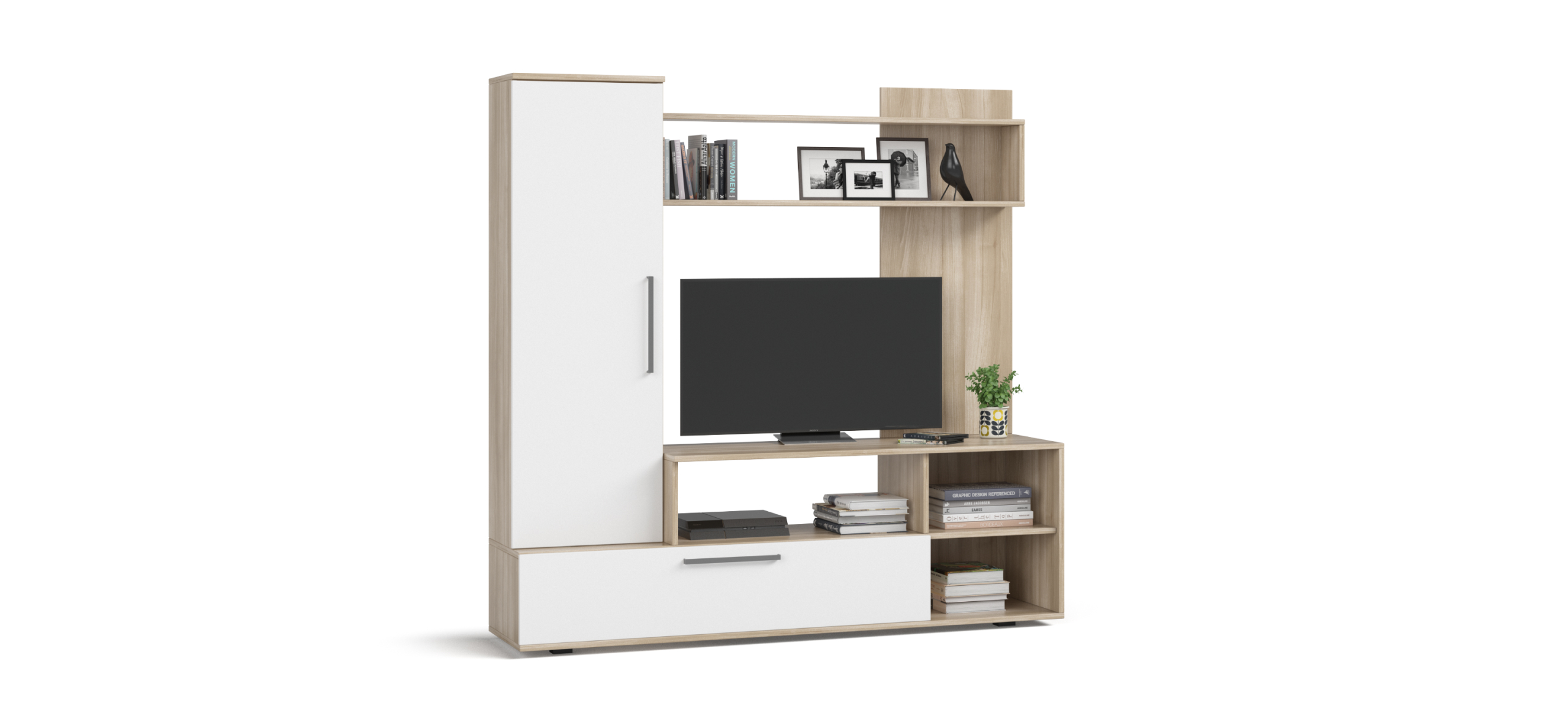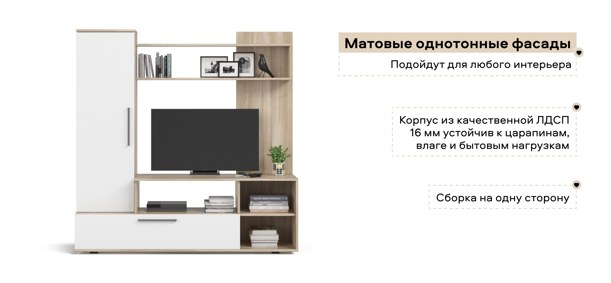 Денвер- компактная стенка для гостиной, хорошо подходит для хранения полезных вещей и размещения памятных сувениров или любимых книг. На ее высокой тумбе разместится любой современный телевизор, а ее высота оптимально подходит для его просмотра, когда вы сидите на диване.