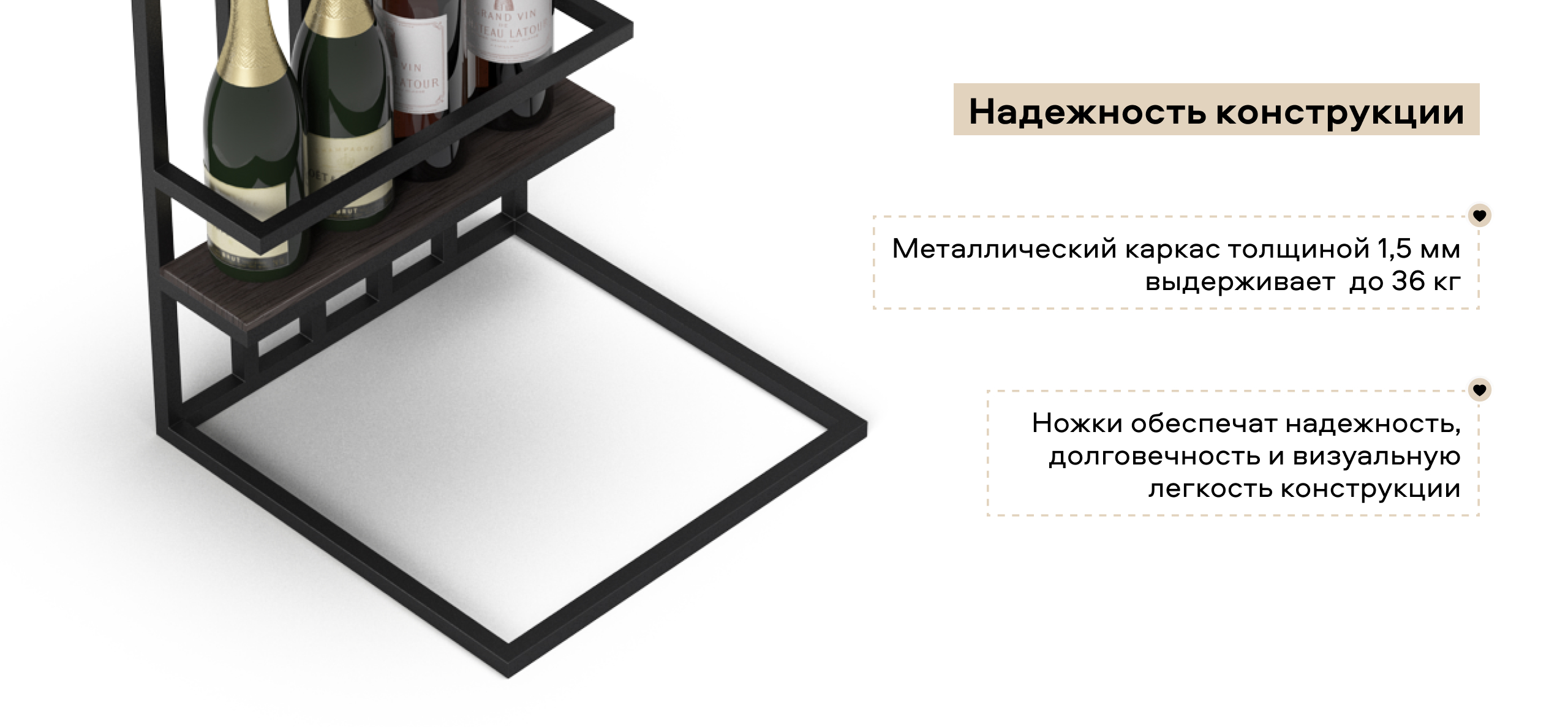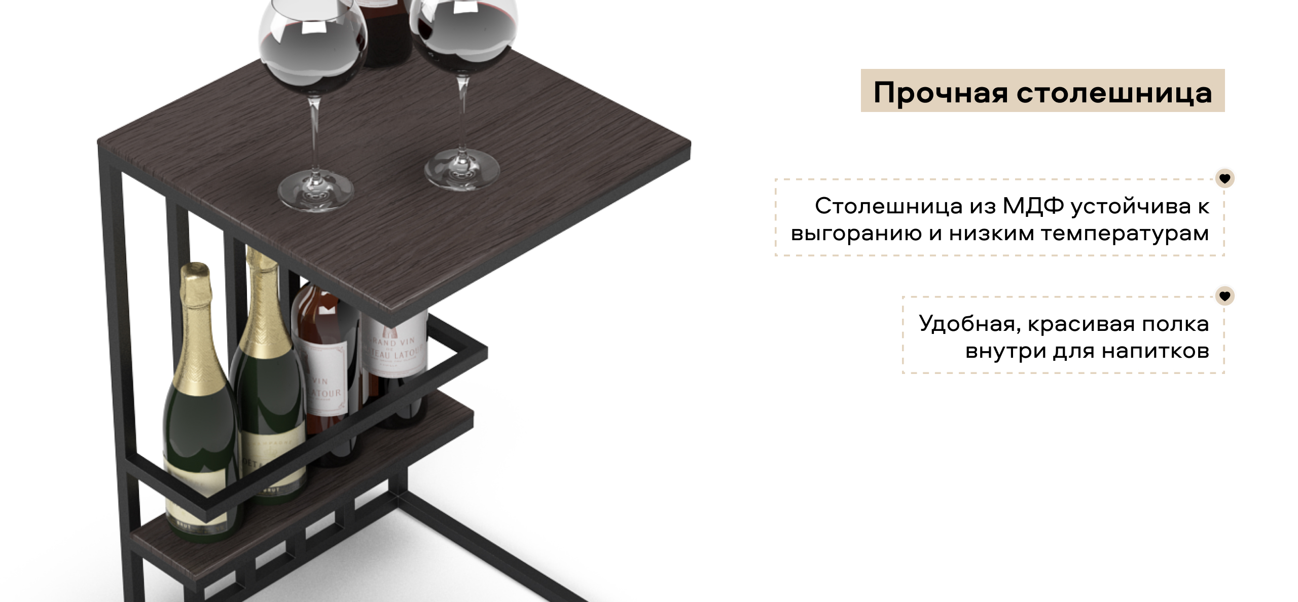 Металлический каркас толщиной 1,5 мм. выдерживает до 36 кг. Столешница из MDF устойчива к выгоранию и низким температурам.