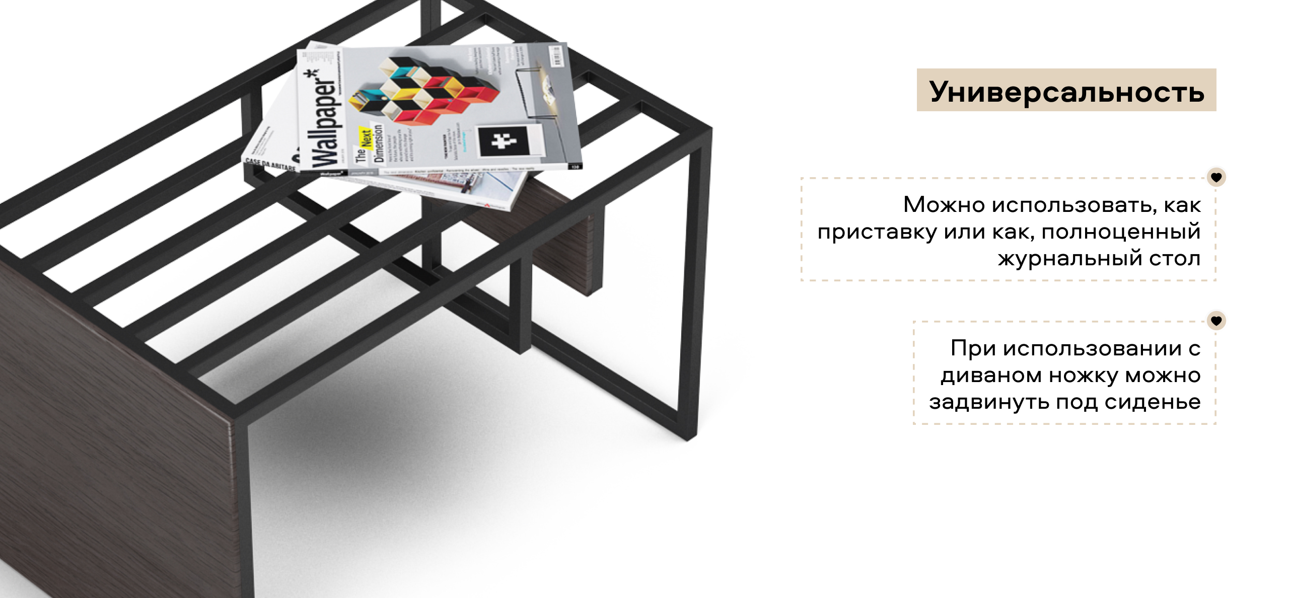 2 варианта установки: стол-приставка или журнальный столик. При использовании с диваном, ножку можно задвинуть под сиденье.